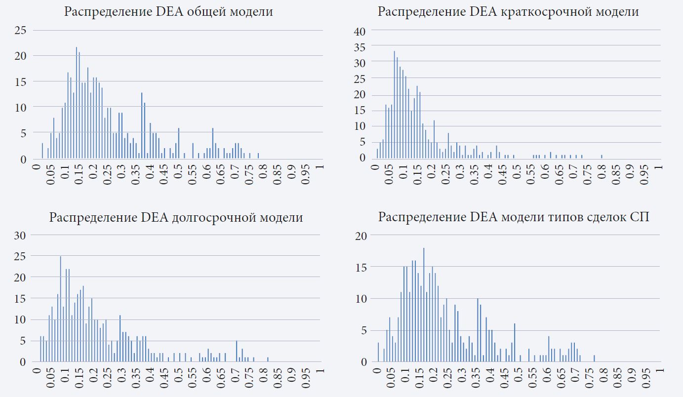 В табл. 2 представлена описательная статистика независимых переменных. Для объектов поглощения, как правило, характерна более высокая интенсивность ИиР, чем у фирм-покупателей. Но последние обычно имеют больше патентов. Эти выводы согласуются с результатами ранее проведенных исследований, в которых отмечается, что фирмы, активно занимающиеся ИиР, с большей вероятностью становятся объектами поглощения, а компании-покупатели располагают более значительным числом патентов (Bena, Li, 2014). Инвесторы чаще всего положительно реагируют на сообщения о СП. На рис. 1 представлено распределение значений показателя эффективности DEA.