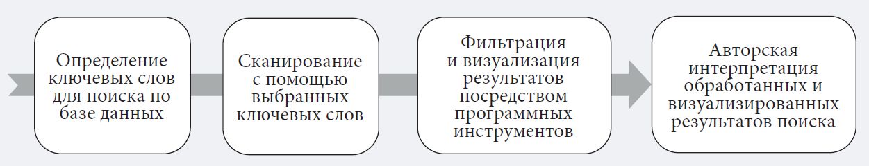 Наше исследование основывается на библиометрическом анализе с использованием базы Scopus — одного из наиболее обширных навигаторов по научным публикациям (Falagas et al., 2008; Mongeon, Paul-Hus, 2016). Этапы работы отражены на рис. 1. Поиск проводился в 2022 г. по ключевым словам, относящимся к двум основным темам: «кибербезопасность» и «управление». Формула поискового запроса выглядела следующим образом: