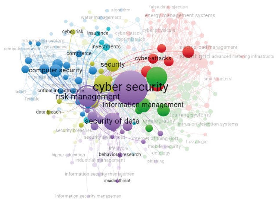 На рис. 2 представлены семь выявленных кластеров исследований в области кибербезопасности, обозначенных разными цветами. Термин «кибербезопасность» чаще всего встречается в желтом и красном кластерах (532 раза), как и «сетевая безопасность» (172). Данные понятия также наиболее распространены по всем кластерам (2930 и 1334 раза соответственно). Прослеживаются тесные связи двух упомянутых кластеров с другими ключевыми словами — «инвестиции», «человеческие ресурсы», «критическая инфраструктура», «информационные услуги», «принятие решений», «государственная политика», «управление рисками» и «экономика». Это свидетельствует об общем признании необходимости выстраивать унифицированные подходы к управлению кибербезопасностью для защиты критически важных инфраструктур, включая системы интернет-голосования, банковские системы и энергоснабжение (Katsikeas et al., 2021). Частая со-встречаемость пары ключевых слов «кибербезопасность» — «люди» указывает на актуальность управления человеческими ресурсами для разработки стратегий по нейтрализации киберугроз.