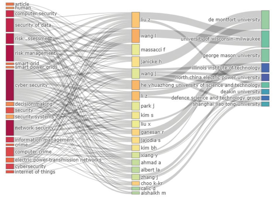 На основе графиков с тремя рядами данных (рис. 3) построена «диаграмма Санки» (Sankey diagram), иллюстрирующая наиболее влиятельных авторов, организации и распространенные ключевые слова (рис. 4). Максимальное число упоминаний термина «кибербезопасность» выявлено в работах Цзи Лю (Zhi Liu), Ляньина Ванга (Lanjing Wang) и Фабио Масаччи (Fabio Masacci), которые также активно используют второе по значимости понятие «управление рисками». Среди организаций термин «кибербезопасность» чаще всего употребляется сотрудниками Университета Де Монфора (De Montfort University), о чем свидетельствует толщина потока между соответствующими полями на диаграмме. Таким образом, библиометрические данные указывают на растущее число исследований в рассматриваемом направлении. Наибольший интерес вызывают стратегии управления рисками для защиты от кибератак.