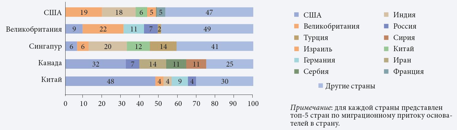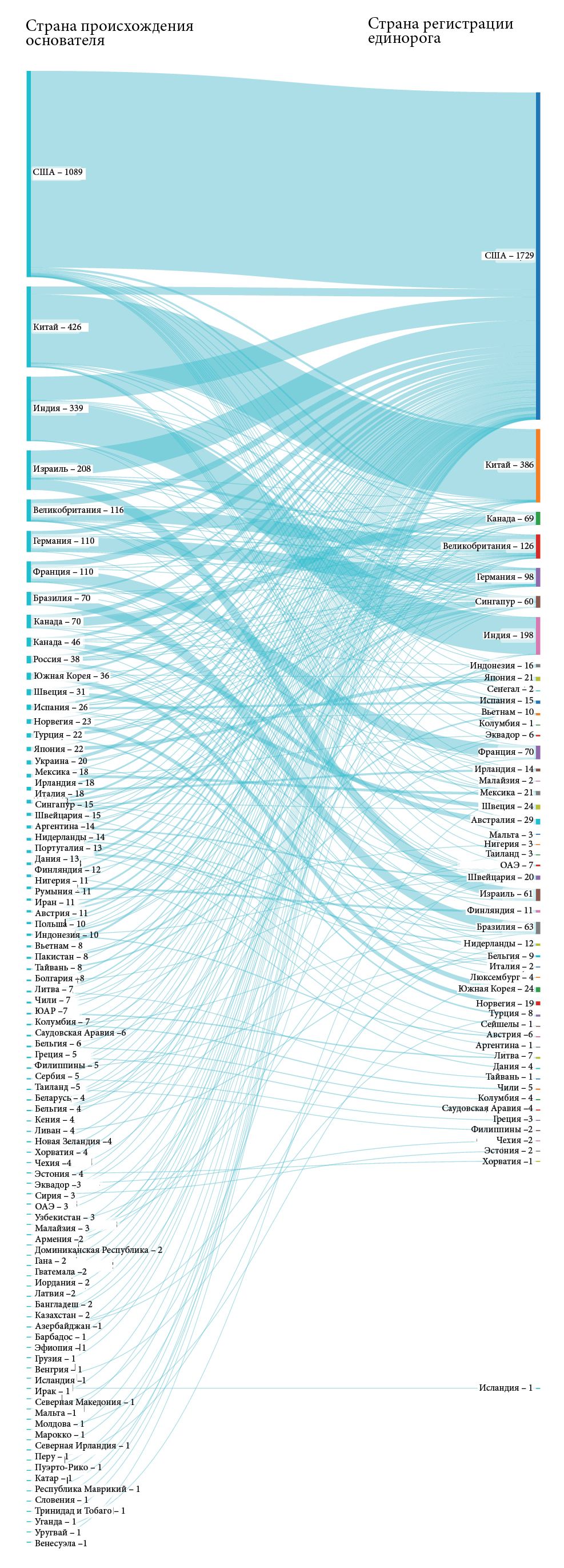 23 Лишь три единорога из топ-10 по оценочной стоимости не имеют иностранных основателей: интернет-компания ByteDance — 180 млрд долл. и 1-е место по стоимости среди всех единорогов; платежная платформа Ant Group — 150 млрд долл. и 2-е место; сервис для графического дизайна Canva — 40 млрд долл. и 7-е место. Топ самых дорогих миллиардных стартапов с зарубежными основателями возглавляют космическая корпорация SpaceX (125 млрд долл. и 3-е место по стоимости), ритейлер модной одежды Shein (100 млрд долл. и 4-е место) и американский финтех-стартап Stripe (95 млрд долл. и 5-е место).