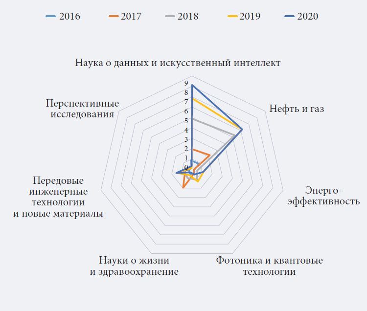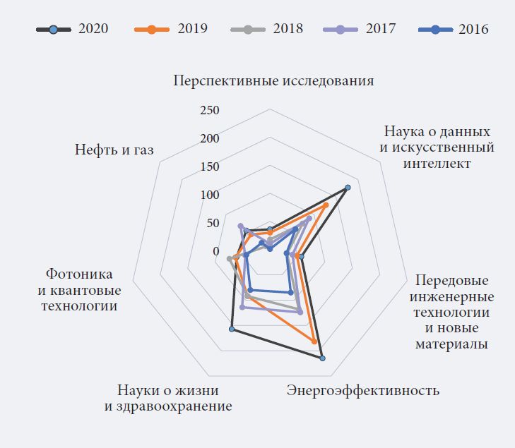 Диаграмма, приведенная на рис. 3, показывает сходную динамику применительно к фундаментальным исследованиям. В 2020 г. больше всего грантов привлекли «Наука о данных и ИИ» и «Энергоэффективность». «Перспективные исследования» ориентированы исключительно на грантовое финансирование, a «Нефть и газ» и «Передовые инженерные технологии и новые материалы» носят выраженно прикладной характер.