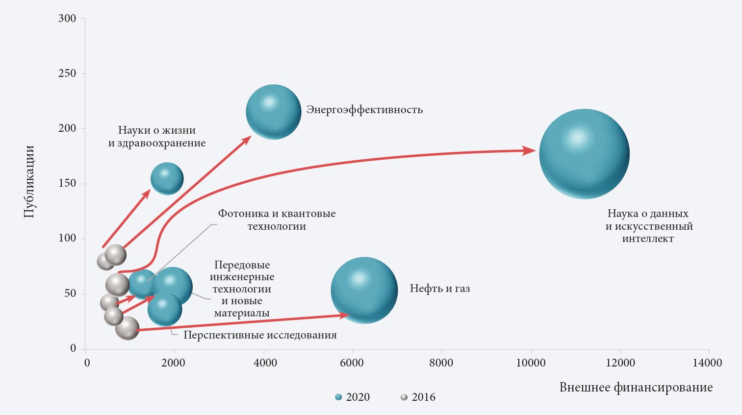 В ходе анализа публикационной активности и объема привлеченного финансирования ключевых исследовательских направлений Сколтеха оценивалась также динамика их развития за период 2016–2020 гг. Полученные результаты позволили прийти к нескольким важным выводам.