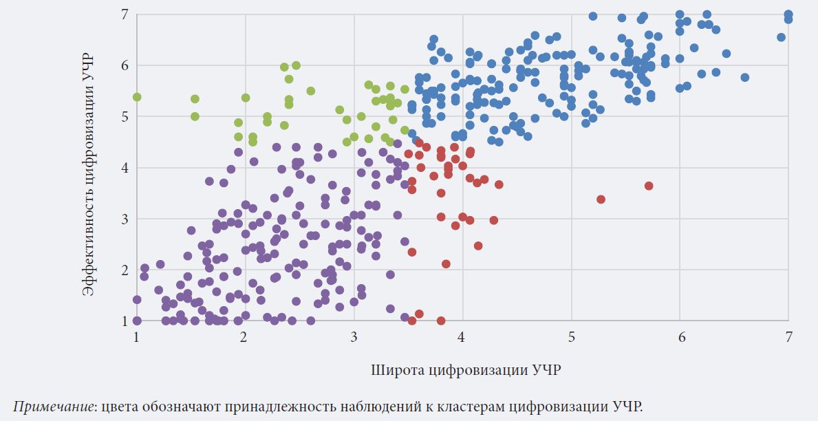 «Половинчатые» стратегии цифровизации УЧР оказываются наименее эффективными с точки зрения результативности. Второй (высокая эффективность, небольшой охват) и третий кластеры (низкая эффективность, большой охват) демонстрируют одинаково низкие показатели роста и рентабельности.