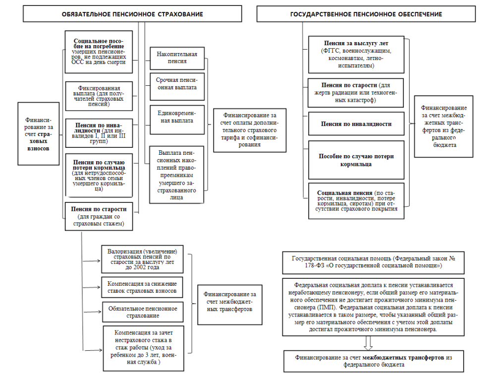 Пенсионная система России включает в себя обязательное пенсионное страхование11 и государственное пенсионное обеспечение12, отличающиеся институциональными особенностями и источниками финансирования выплат. В рамках пенсионного страхования нетрудоспособным гражданам выплачивается страховая пенсия, которая является компенсацией утраченного заработка по причине наступления страхового случая: старости, инвалидности или потери кормильца. В рамках государственного пенсионного обеспечения устанавливается государственная пенсия, которая представляет собой ежемесячную денежную выплату нетрудоспособным гражданам, гарантирующую защиту от бедности.