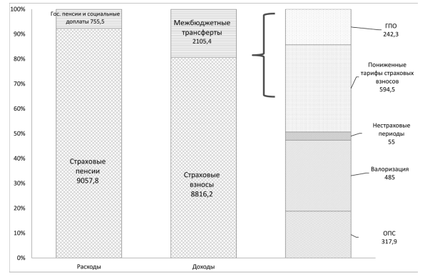 Современная пенсионная система, основанная на страховом механизме финансирования государственных обязательств, находясь в условиях усиления давления внешних факторов, остаётся сбалансированной за счёт представления межбюджетных трансфертов, составляющих 19,28%. Данный источник компенсирует выпадающие доходы по страховым взносам, учтенные в пенсионных правах нестраховые периоды, социальные доплаты до границы бедности, индексацию и валоризацию. Примечательно, что развитие системы социальной защиты населения привело к её усложнению с появлением многочисленных мер поддержки с регламентированными условиями вхождения.