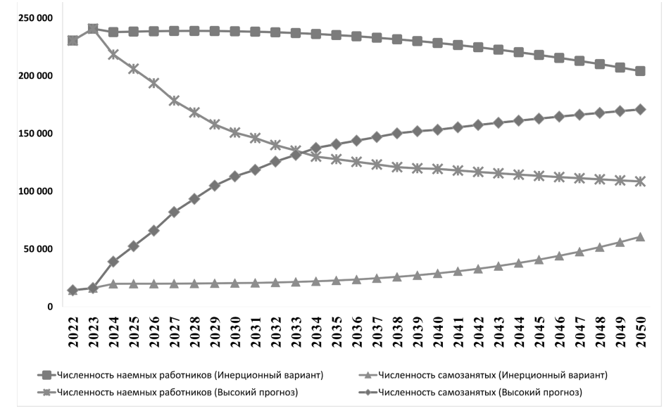 На рисунке 3 представлен прогноз трансформации структуры плательщиков страховых взносов в пенсионной системе до 2050 года по двум вариантам прогноза: умеренный – это сохранение преобладания наёмных работников во всём прогнозном периоде и интенсивный – увеличение численности самозанятых работников. В случае развития умеренного сценария структура плательщиков страховых взносов не изменится. Численность наёмных работников уменьшится на 36,6 тыс. человек или 15%. Доля самозанятых в общей численности работающего населения в Республике Марий Эл увеличится до 22,9%. В исходной точке прогноза в 2022 году численность самозанятого населения была рассчитана в количестве 16,2 тыс. человека. При интенсивном сценарии структура плательщиков страховых взносов кардинально изменится. К 2034 году численность наёмных работников и самозанятых сравняется. А в 2050 году 38,8% будут составлять наёмные работники, 61,2% – самозанятые. Рост численности самозанятого населения отмечается и в исследованиях других авторов [22; 23; 24].