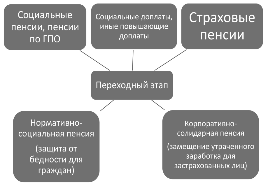 Таким образом, изменения внешних факторов, влияющих на пенсионирование граждан, подчёркивают предпосылки к трансформации существующей модели пенсионной системы путем выделения условно нормативно-социальной пенсии на основе концепции базового дохода и корпоративно-солидарной пенсии, основанной на страховой схеме. Предполагается, что наибольшие предпосылки к корректировке имеют социальные и государственные пенсии, социальная доплата к пенсии и фиксированная выплата к страховой пенсии.