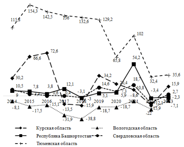 Как видно из рисунка 1 самая благополучная миграционная ситуация среди пяти анализируемых регионов страны наблюдается в Тюменской области. Самая неблагополучная миграционная ситуация – в Вологодской области. Во всех рассматриваемых регионах, кроме Курской области, по результатам 2021 года показатель сальдо миграции улучшался. Это связано с отложенными планами населения уехать из региона на постоянное место жительства в другой регион или страну, а также с людьми, которые вернулись в регион во время пандемии коронавируса. В 2022 году миграционная ситуация в этих регионах ухудшилась из-за политической обстановки в стране, связанной с СВО и последующей мобилизацией мужского населения. В 2023 году ситуация во всех пяти регионах стала улучшаться.