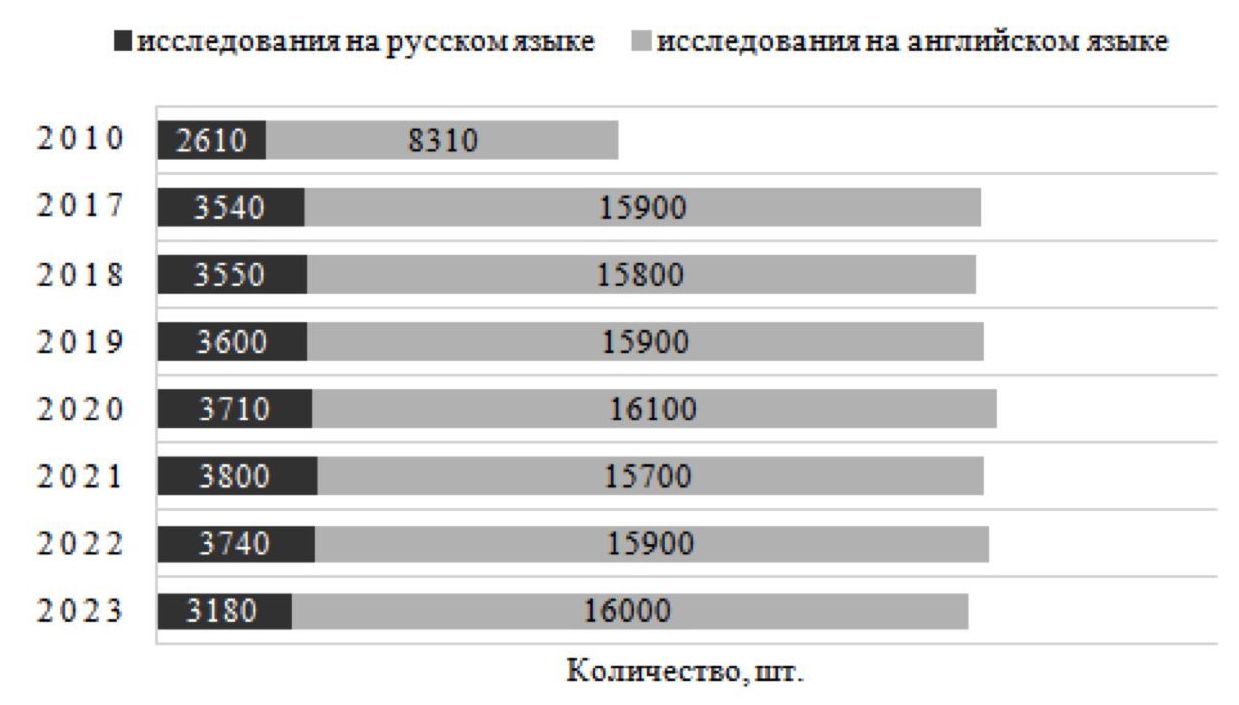 Рисунок 1. Ежегодное количество исследований по креативной экономике в зарубежных и отечественных исследованиях
