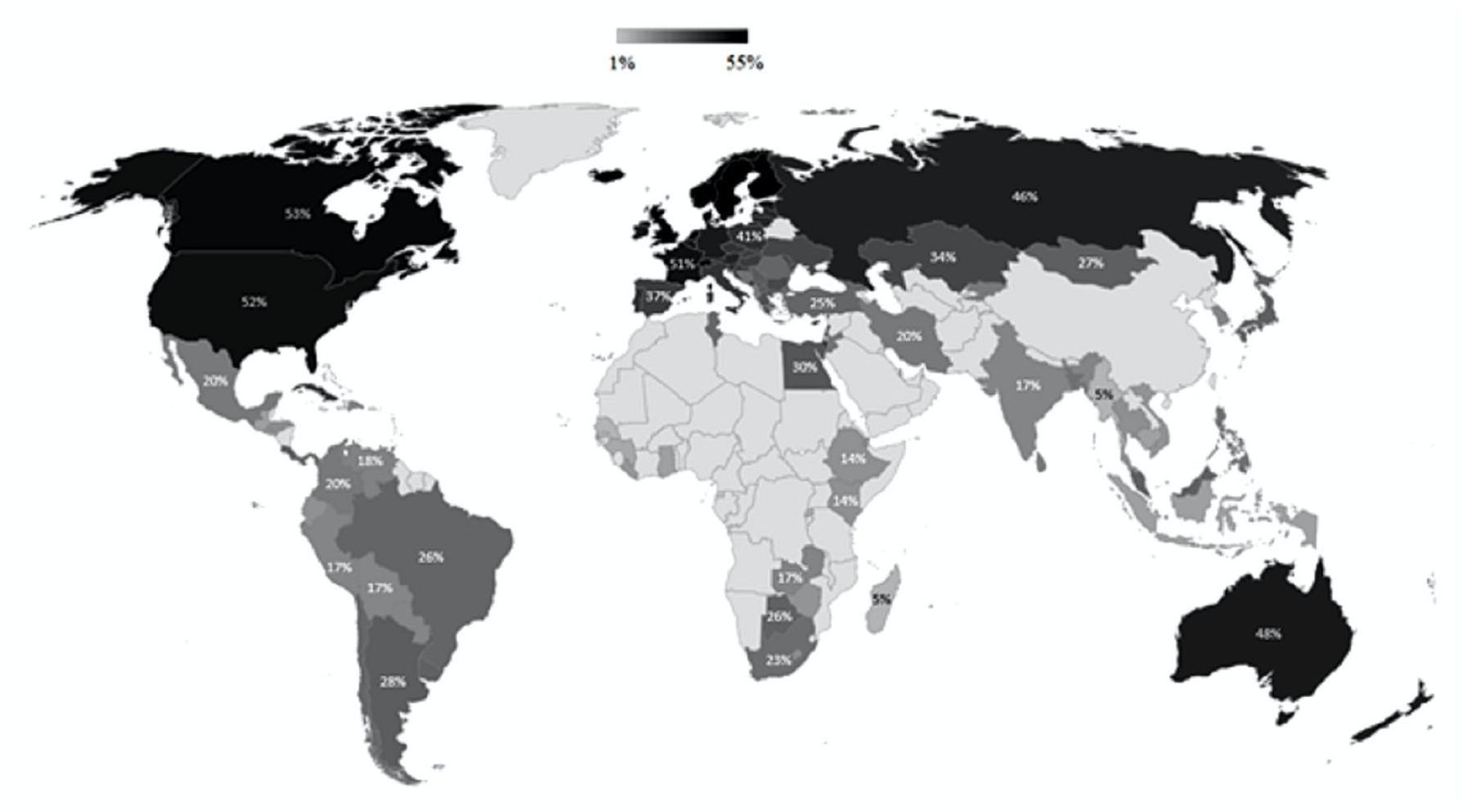 Figure 2. Share of the «creative class» among the employed by country (1%–55%), 2022