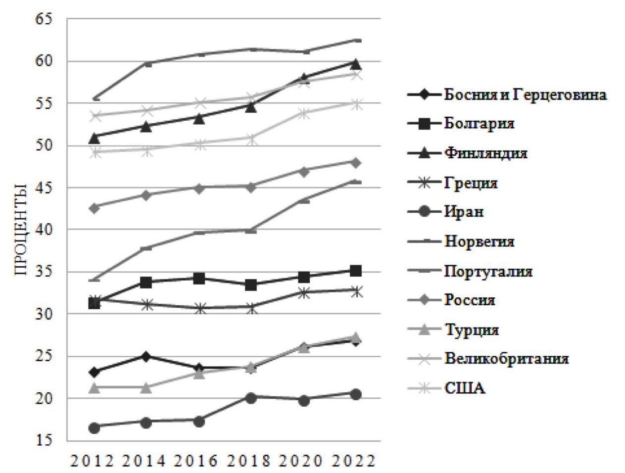 Страны, представленные наиболее светлым цветом, не предоставляют статистики, соответствующей унифицированным кодировкам профессий, что не позволяет оценить работников творческого труда. Лидерами по доле «креативного класса» стабильно на протяжении десятилетий являются Великобритания, Люксембург, Норвегия, Швеция, Исландия, Дания, Финляндия, Сингапур. Особый научный интерес вызывает статистика Китая (она традиционно не доступна), и по суммарному анализу ряда исследований (указанные ранее статистические базы, а также [10]) можно сделать предположение о примерно 25%-ой доле креативных профессионалов от занятых, что ставит страну на уровень с развивающимися экономиками.