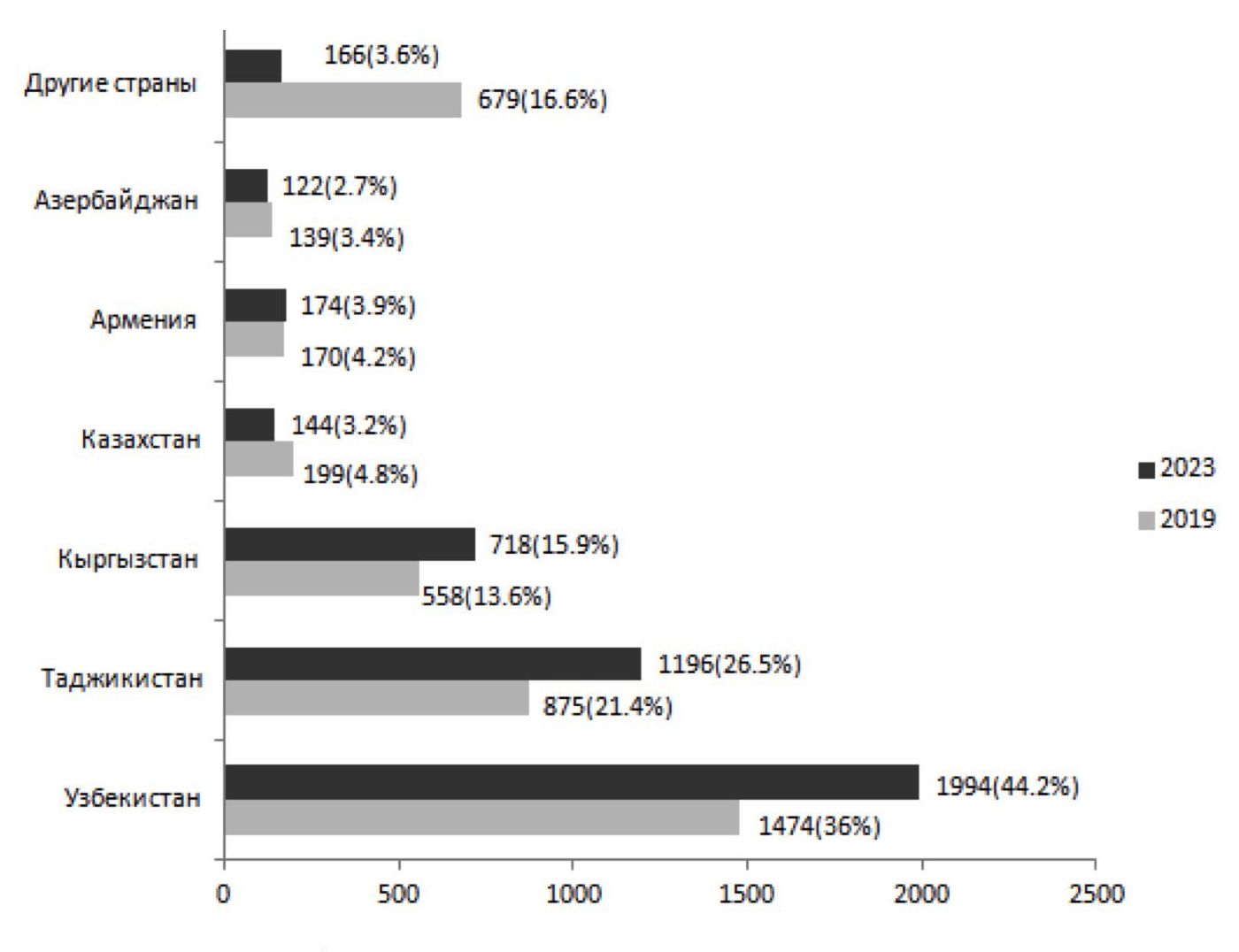 Данные рисунка 1 свидетельствует о том, что 96,4% всей трудовой иммиграции в 2023 году представлено странами СНГ, в составе которых выделяются бедные страны ЦА, являющиеся основными донорами неквалифицированной рабочей силы в Россию. Так, Узбекистан, Таджикистан и Кыргызстан представлены 3,9 млн чел., или 86,6% от общей численности приехавших на работу. При этом динамика свидетельствует о росте удельного веса их граждан в 2023 году по сравнению с 2019 годом. Так, количество прибывших на работу граждан Узбекистана увеличилось с 36% до 44,2%, Таджикистана с 21,4% до 26,5% и Киргизии с 13,6% до 15,9%.