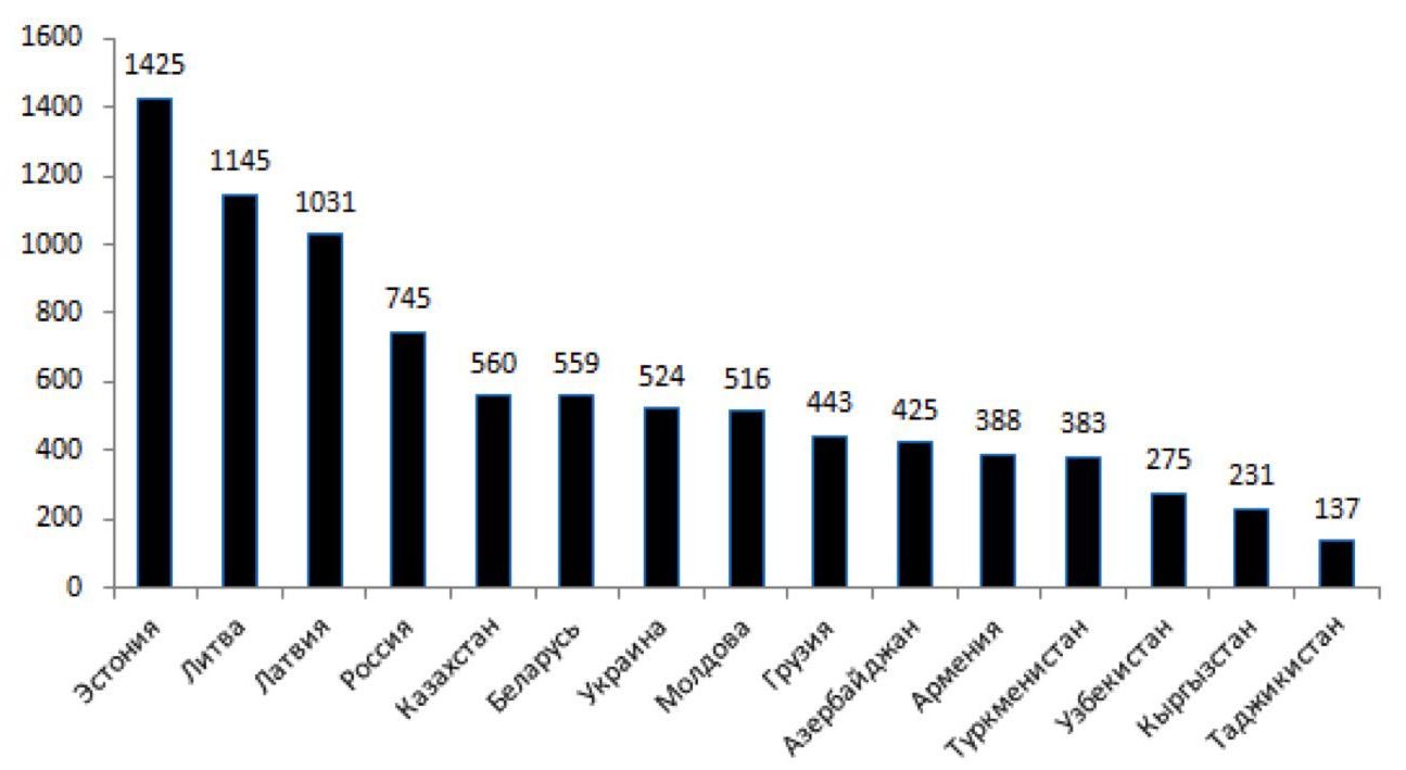 Рисунок 2. Среднемесячные заработные платы по странам бывшего СССР (2021) (в долл. США по курсу на 25.12.2021)