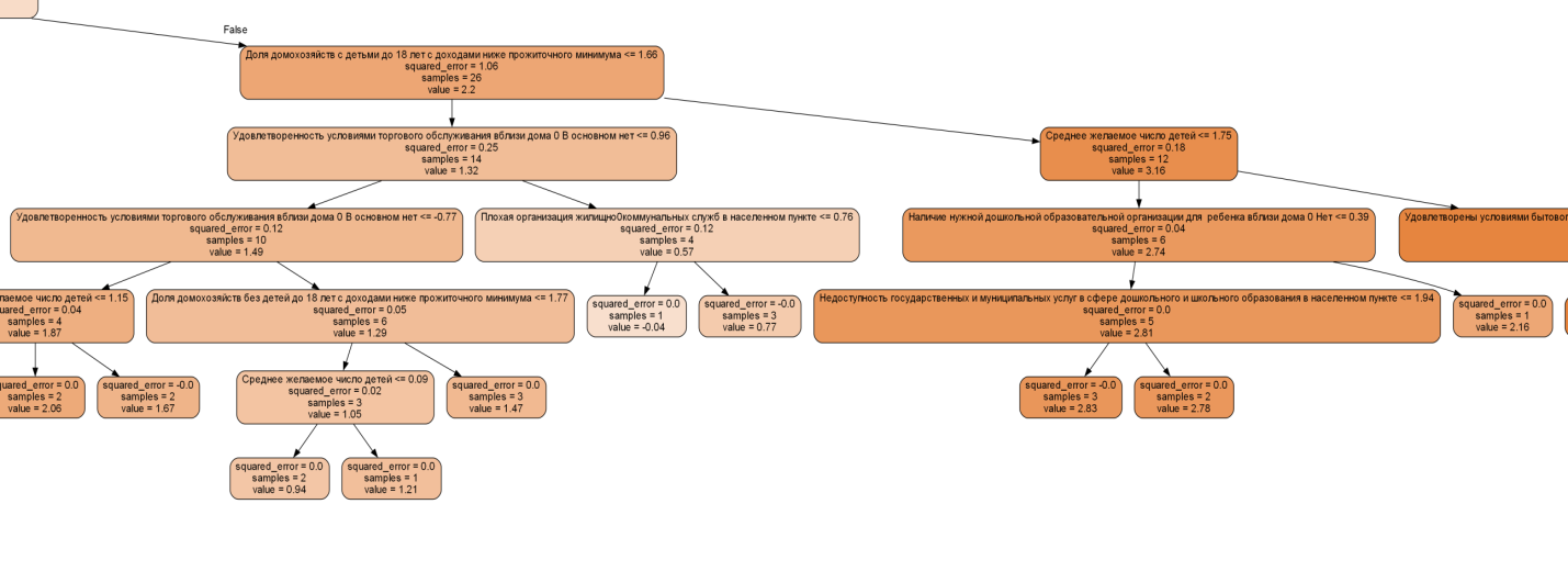 В качестве примера на рисунке 1 приведён фрагмент визуализации дерева решений для СКР по субъективным оценкам социально-экономических факторов влияния на рождаемость.