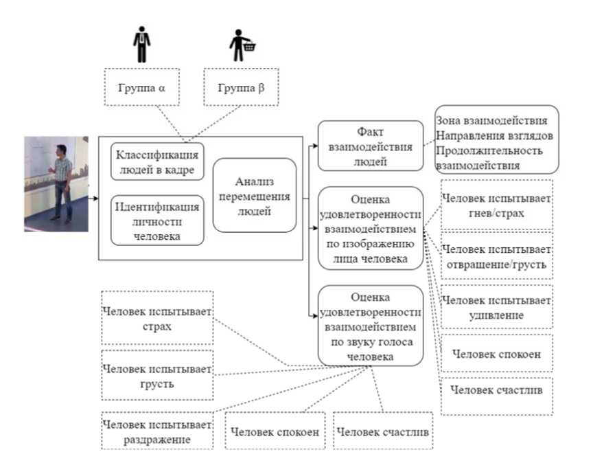 Концепция объединяет классификацию и идентификацию людей по цвету одежды, отслеживание их перемещения в ограниченном пространстве, определение взаимодействия людей и анализ удовлетворённости взаимодействием по эмоциям человека, распознаваемым по голосу и мимике лица. Реализация концепции ориентируется на использование уже существующих аппаратно-программных систем и средств видеонаблюдения за взаимодействием людей, дополненных разработанными методами и алгоритмами [10, 15-17].