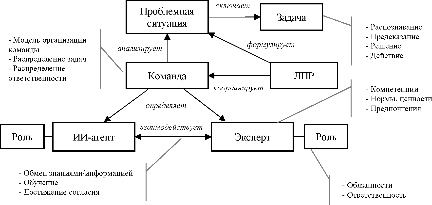 Исходной точкой для функционирования такой СППР является взаимодействие между лицом, принимающим решение (ЛПР), и командой, состоящей из людей-экспертов и ИИ-агентов. ЛПР формулирует проблемную ситуацию и для поиска возможных ее решений (и их оценки) формируется команда, включающая как людей (экспертов), так и ИИ-агентов (программные компоненты, как правило, реализующие какие-то интеллектуальные функции обработки информации и способные принимать участие в коллективной работе над задачей). ЛПР может принимать участие в формировании и координации работы команды. Команда, в свою очередь, формируется динамически под проблемную ситуацию. При этом, существенными характеристиками команды являются [29]: модель организации команды (схема подчинения), способы распределения задач и ответственности.