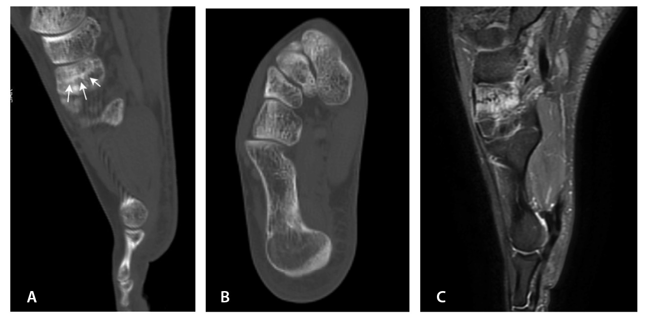 МРТ – наиболее подходящий метод визуализации остеохондрального повреждения купола таранной кости с чувствительностью и специфичностью 96% [52]. В исследованиях M. Haubro и соавт. [53], M. P. Wilson и соавт. [28] МРТ квалифицирована как золотой стандарт диагностики скрытых переломов по сравнению с КТ и рентгенографией. Протокол, состоящий из корональных T1-взвешенных изображений и STIR, обладает 100% чувствительностью в выявлении рентгеннегативных переломов (рис. 3) [28].