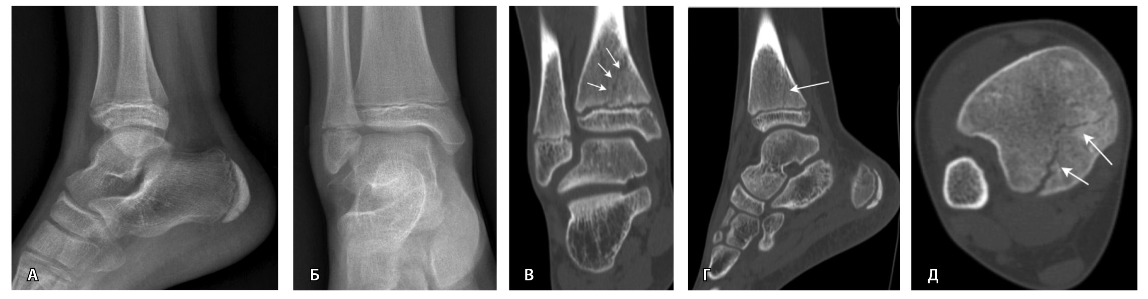 Рис. 2. Рентгеннегативный перелом дистального метадиафиза большеберцовой кости 2-го типа по Солтеру – Харрису (стрелки) у мальчика 11 лет: А, Б – рентгенография; В – компьютерная томография (КТ), корональная плоскость; Г – КТ, сагиттальная плоскость; Д – КТ, аксиальная плоскость