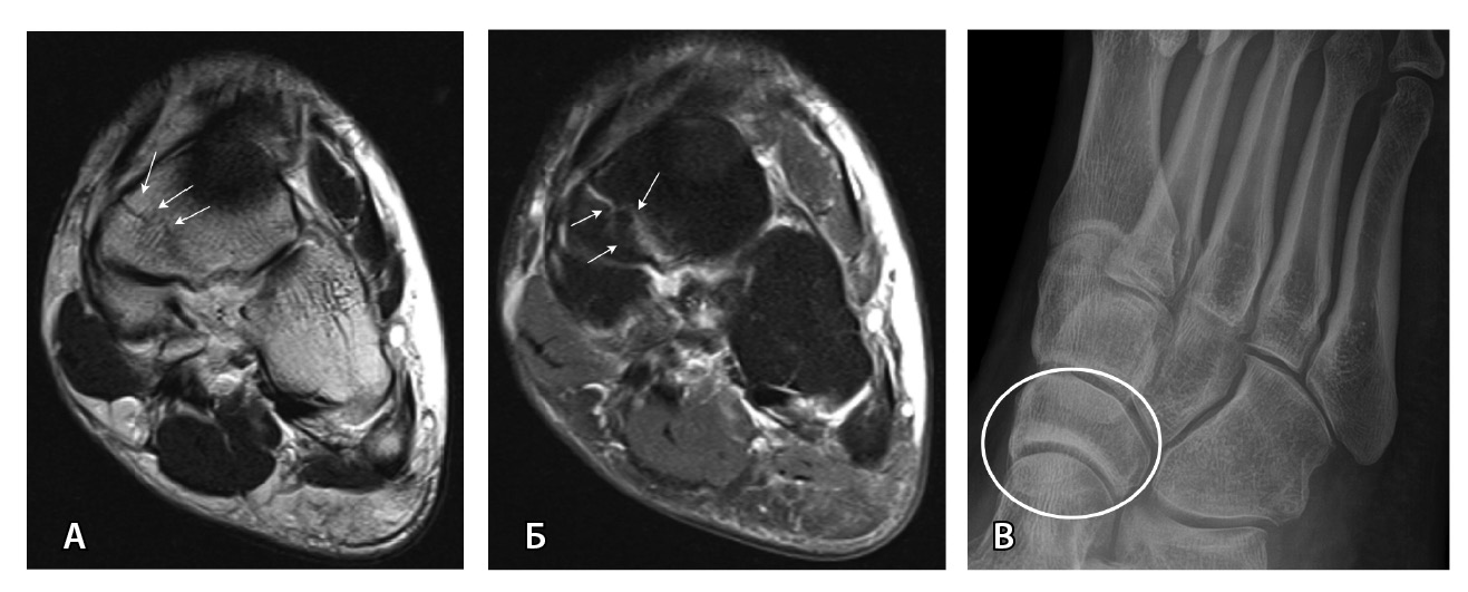 МРТ – наиболее подходящий метод визуализации остеохондрального повреждения купола таранной кости с чувствительностью и специфичностью 96% [52]. В исследованиях M. Haubro и соавт. [53], M. P. Wilson и соавт. [28] МРТ квалифицирована как золотой стандарт диагностики скрытых переломов по сравнению с КТ и рентгенографией. Протокол, состоящий из корональных T1-взвешенных изображений и STIR, обладает 100% чувствительностью в выявлении рентгеннегативных переломов (рис. 3) [28].