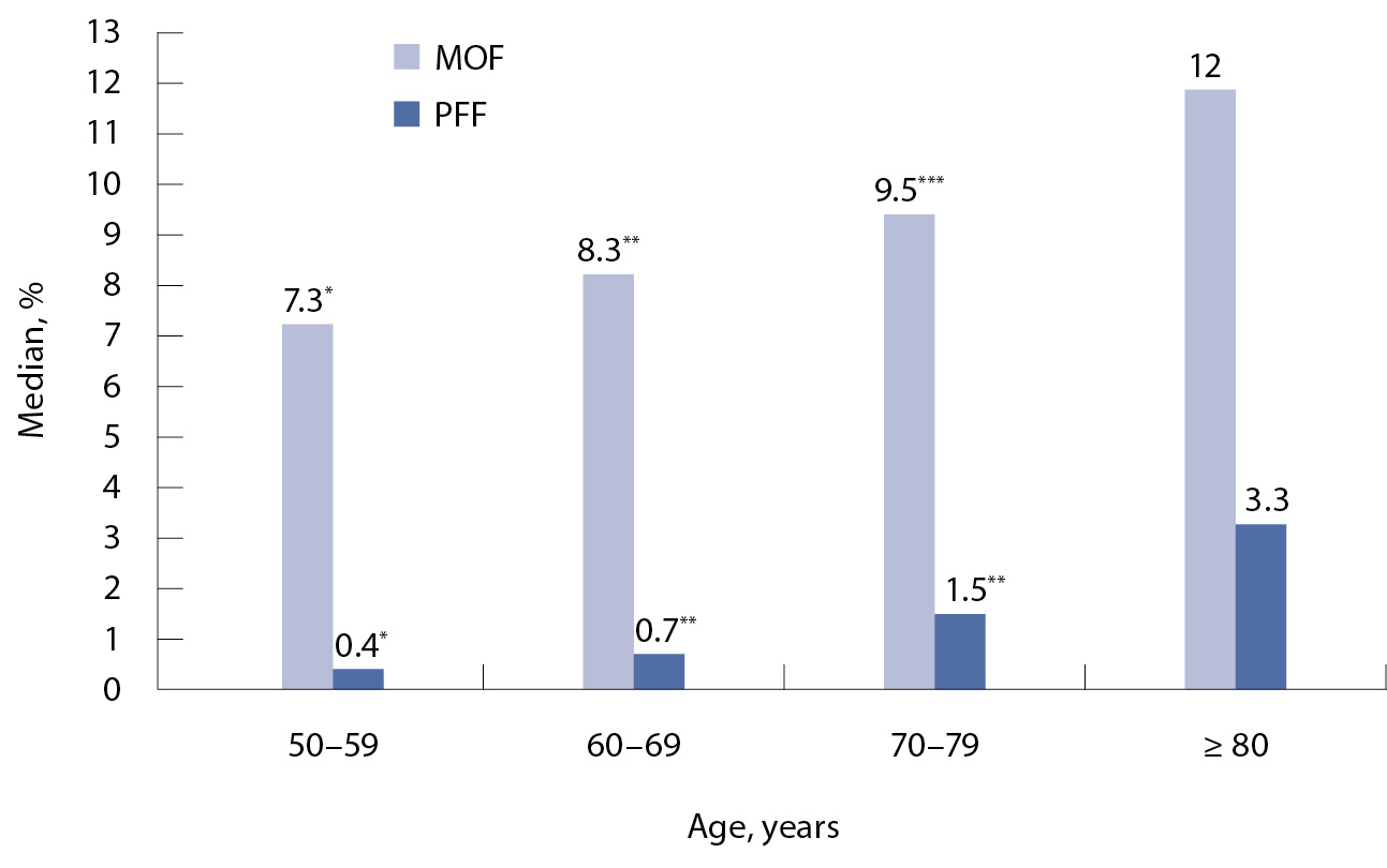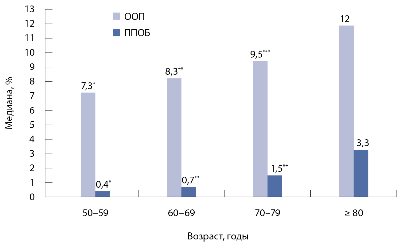 Рис. 1. Медиана FRAX у женщин различных возрастных групп; ООП – основные остеопорозные переломы, ППОБ – переломы проксимального отдела бедра; * p < 0,001 по сравнению с группами 60–69, 70–79 и 80 лет и старше; ** p < 0,001 по сравнению с группой 80 лет и старше; *** p = 0,03 по сравнению с группой 80 лет и старше