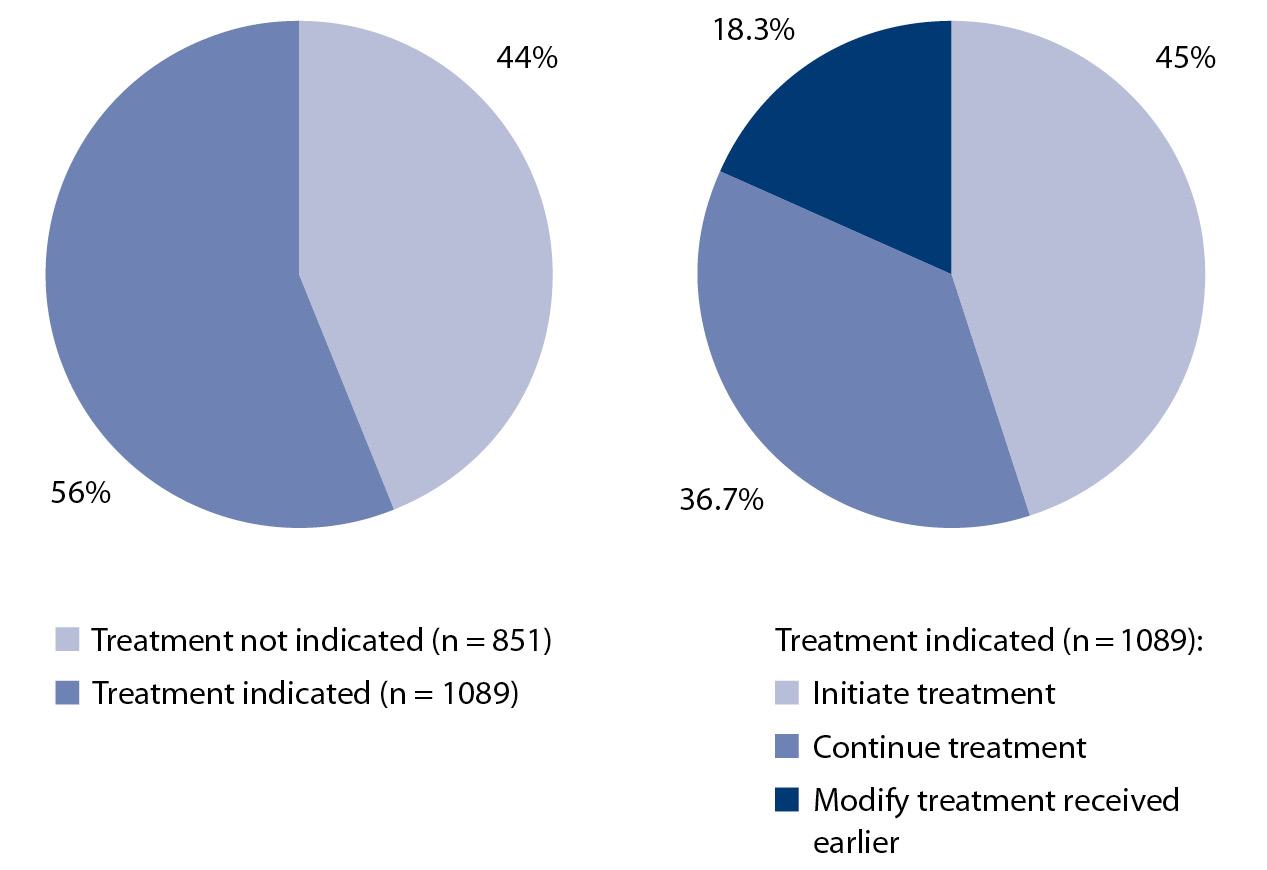 Число пациентов, которым показано терапевтическое вмешательство, составило 56% (n = 1089), из них инициировать терапию было рекомендовано 45% (n = 489), продолжить прием ранее используемых препаратов – 36,7% (n = 400), изменить тактику лечения – 18,3% (n = 200) (рис. 4). В том числе антирезорбтивная терапия назначалась при установленной костной форме первичного гиперпаратиреоза или пациентам, получающим ингибиторы ароматазы по поводу рака молочной железы с целью профилактики потерь МПК (n = 57).