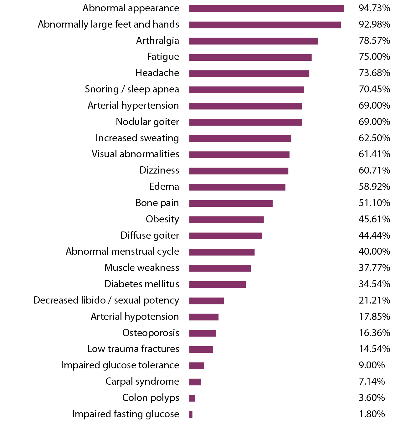 Наиболее часто регистрировались следующие проявления заболевания: изменение внешности, увеличение кистей и стоп, артралгии, общая слабость, цефалгический синдром, храп / остановки дыхания во сне, повышенная потливость, головокружение, отеки, боли в костях.