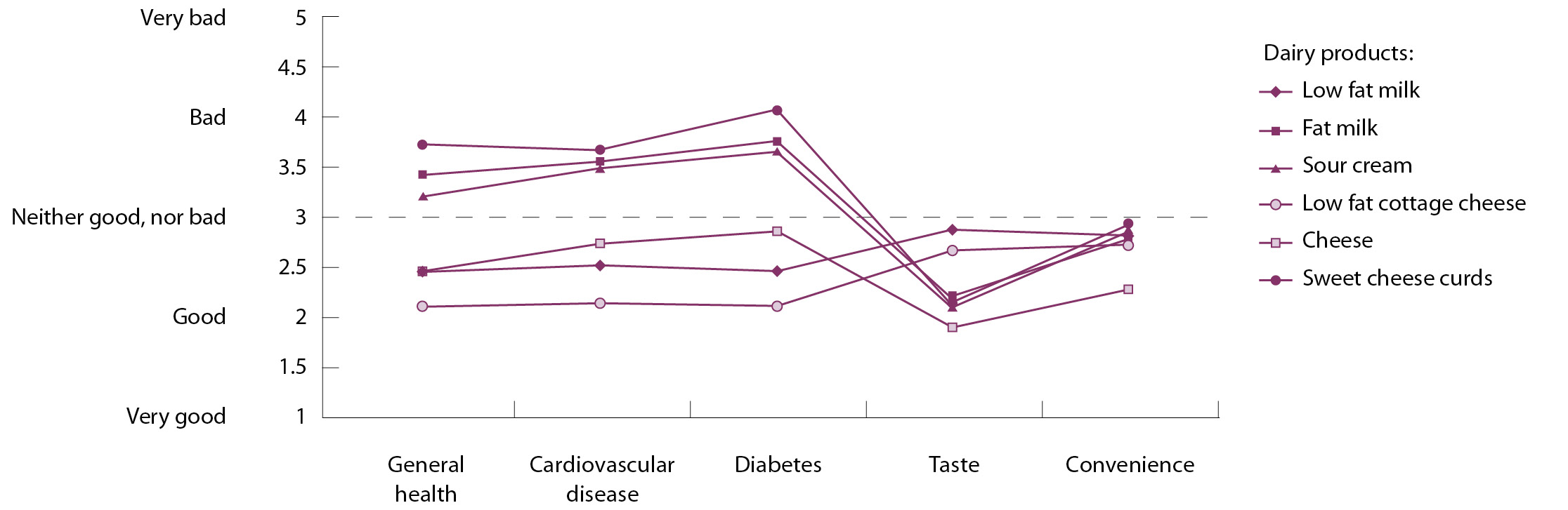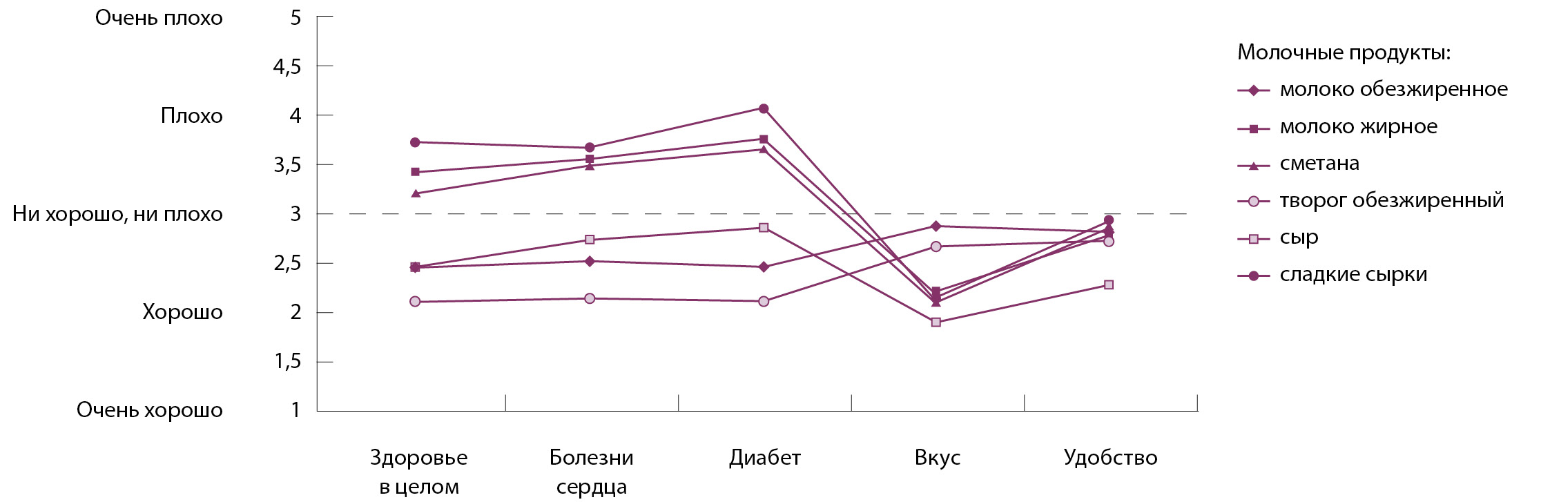 Средние баллы по пяти аспектам восприятия каждого молочного продукта приведены на рис. 1. Построенные кривые отображают существенно различные профили каждого продукта. Они иллюстрируют, что больные СД2 четко дифференцируют продукты по таким аспектам, как польза для общего состояния здоровья, сердечно-сосудистой системы и контроля гликемии. Пациенты считают обезжиренные молоко, творог и в меньшей степени сыр благоприятными в этих отношениях, а жирное молоко, сметану и сладкие сырки – неблагоприятными.