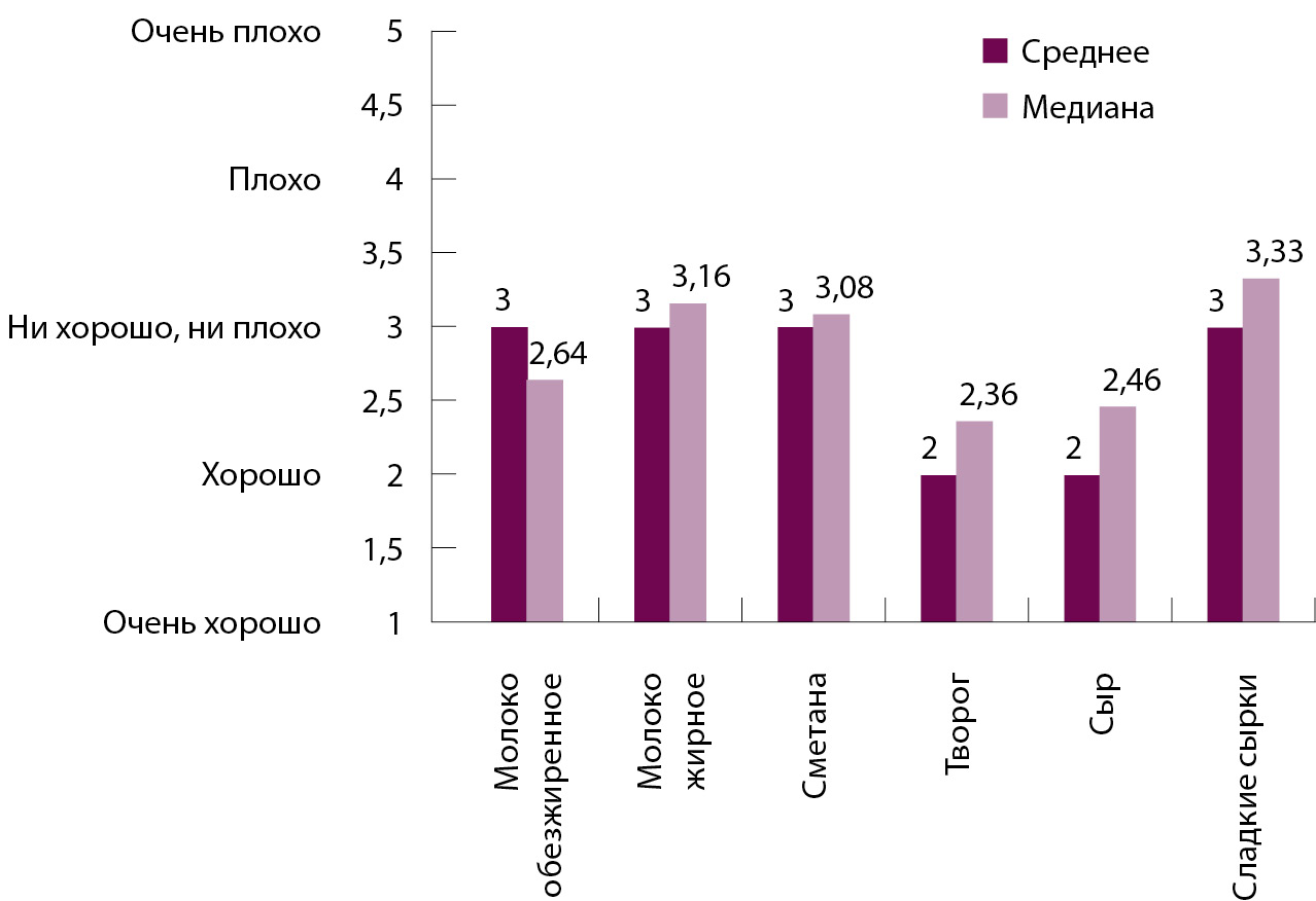 Анализ балльных оценок по различным аспектам субъективного восприятия каждого продукта показывает, что больные СД2 четко дифференцируют значение продуктов по таким аспектам, как польза для общего состояния здоровья, профилактики сердечно-сосудистых заболеваний и текущего состояния СД (контроля гликемии). Обезжиренные молоко, творог и в меньшей степени сыр они считают благоприятными в этих отношениях, сметану – нейтральной, а жирное молоко и сладкие сырки – неблагоприятными. Если обезжиренные молоко и творог как продукты умеренной калорийности с низким содержанием жира действительно являются благоприятными компонентами питания при СД2, попадание сыра в разряд благоприятных, а сметаны в разряд нейтральных для здоровья отражает, вероятно, неосведомленность пациентов о высокой калорийности этих продуктов и высоком содержании в них жиров.