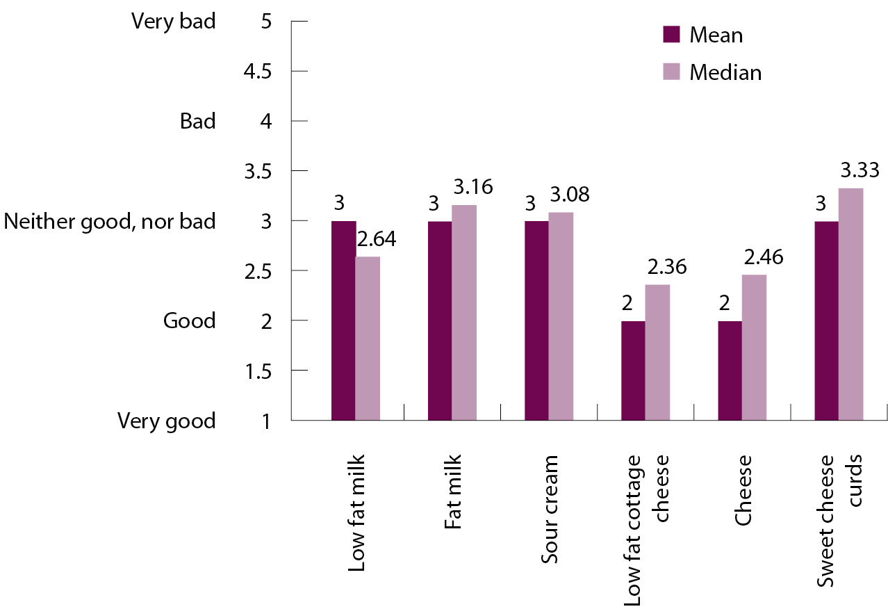 Results: The patients considered low fat cottage cheese to be most healthy for their general health, with low fat milk and cheese ranking 2nd (р < 0.0001 compared to low fat cottage cheese). Fat milk and sour cream were perceived as unhealthy (р < 0.0001 compared to “healthy products”). Sweet cheese curds were perceived by the patients as the most unhealthy/”harmful” (р < 0.0001 compared with each of the rest products). All other medical aspects of food perceptions (impact on cardiovascular prevention and diabetes control) moderately or strongly correlated between each other and with the perception for general health (Spearman's r from 0.42 to 0.72, all р < 0.0001). Taste perceptions of all products, except sour cream, demonstrated moderate correlation with their perception in terms of convenience of the use (Spearman's r from 0.36 to 0.47, all р < 0.0001). Male patients perceived low fat milk as more tasty and sour cream as more healthy, than female patients (р = 0.029 and 0.046, respectively). Female patients found sour cream more tasty (р = 0.019), and low fat cottage cheese and cheese as more healthy, than males (р = 0.009 and 0.014, respectively). The frequencies of the product use was associated with medical aspects of their perceptions: patients use to eat/drink low fat milk, low fat cottage cheese and cheese significantly more often, than high fat milk and sweet cheese curds (р < 0.0001), whereas sour cream was in an intermediate position as per its frequency of the use. Low fat cottage cheese and cheese ranked first according to the proportion of their consumers (91.3 and 90.7% of the patients, respectively), low fat milk ranked second (82% of the patients), and sour cream third (75%), whereas most patients abstain from the use of fat milk and sweet cheese curds (32 and 32.3% using them, respectively). The frequency of the reference product use was to a significantly lesser extent associated with perceptions of their taste or convenience of the use and was not at all associated with their costs/prices.