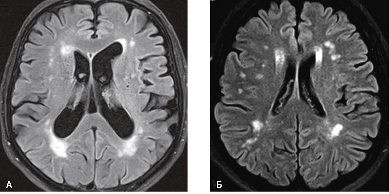 Рис. 1. Умеренный лейкоареоз вокруг желудочков – 2-я степень по шкале Фазекаса в перивентрикулярной зоне (А) и умеренное поражение субкортикальной зоны с множественными точечными и единичными сливными очагами глиоза – 2-я степень по шкале Фазекаса в субкортикальной зоне (Б). Суммарная оценка (перивентрикулярная зона + субкортикальная зона) – 4-я степень по шкале Фазекаса
