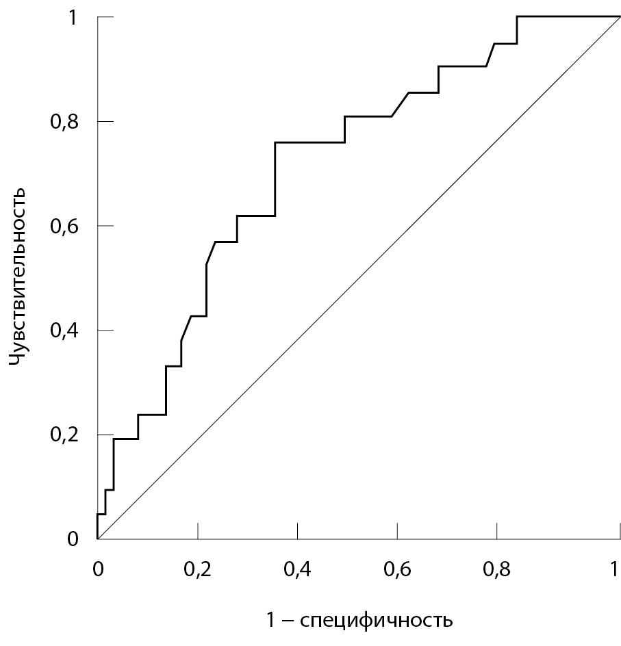 Для определения оптимального порогового значения функции вероятности P выполнен ROC-анализ (рис. 2). Пороговое значение выбрано по принципу равенства чувствительности и специфичности. При значении функции вероятности P = 0,228 модель имеет чувствительность 76% и специфичность 66% (AUC (англ. area under the curve, площадь под кривой) = 0,716; p < 0,001).