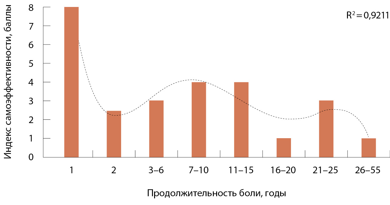 Анализ частоты встречаемости различных (высокого и низкого) уровней самоэффективности в сопоставлении с временной продолжительностью болевого синдрома у пациентов с ноцицептивной болью позволил более углубленно изучить выявленную закономерность. На основании визуально-графического анализа облака данных, отражающих распределение показателей самоэффективности в группах в зависимости от давности возникновения болевого синдрома, выделены временные страты (1 год, 2 года, 3–6 лет, 7–10 лет, 11–15 лет, 16–20 лет, 21–25 лет, 26–55 лет) и изучено пропорциональное соотношение количества наблюдений высокого и низкого уровня самоэффективности в каждой из них. Указанный показатель получил условное название «индекс самоэффективности». Его количественная интерпретация имела следующий вид: значения > 1 свидетельствовали о преобладании высоких показателей самоэффективности; значение, равное 1, – об одинаковом соотношении высокой и низкой самоэффективности; < 1 – о преобладании низких показателей самоэффективности. Результатом аппроксимации полученных данных стала полиноминальная кривая 5-й степени, имеющая четыре экстремума и коэффициент соответствия R2 = 0,92, иллюстрирующая выявленную тенденцию изменения представлений о самоэффективности пациентов в отношении ноцицептивной боли в зависимости от давности возникновения болевого синдрома. Как видно на рисунке, снижение самоэффективности у пациентов с ноцицептивной болью в процессе хронизации болезни имеет характер угасающих колебаний. В целом представления о самоэффективности существенно снижаются (в 8 раз по сравнению с началом заболевания), при этом максимальная (в 4 раза) скорость падения самоэффективности наблюдается на втором году заболевания.