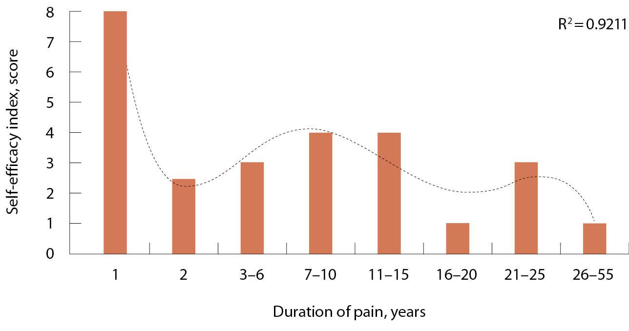 Conclusion: During the first year from the disease manifestation, patients with nociceptive pain are convinced that they have all necessary resources to cope with the disease; mandatory psychological support should be provided to them in the second year, with a dramatic drop of their self-efficacy. As for patients with mixed types of pain, the inclusion of sessions with a medical psychologist into their individual rehabilitation plan is advisable regardless of the duration of the pain syndrome.