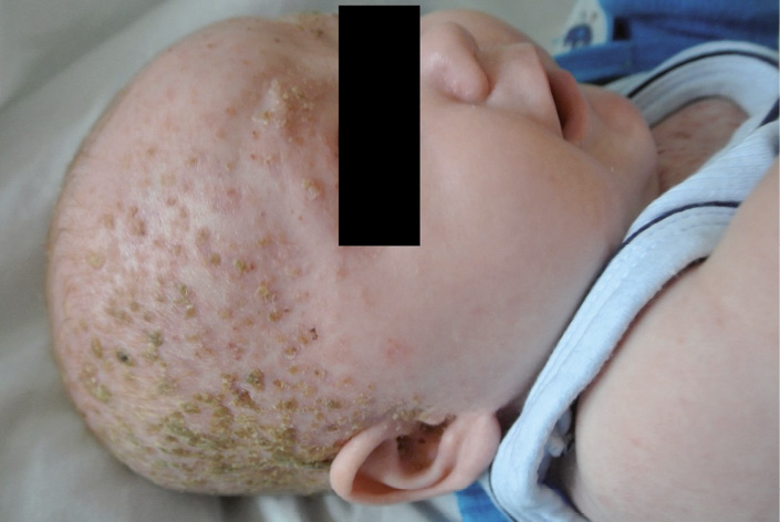 Рис. 1. Ребенок 2 месяцев c диагнозом гистиоцитоза из клеток Лангерганса (болезнь Абта – Леттерера – Сиве). Status localis: патологический кожный процесс островоспалительного характера, симметричный, локализован на волосистой части головы и представлен множественными розовыми папулами, поверхность которых покрыта обильными желтыми корками. В центре ряда папул формируются некрозы с геморрагическим компонентом (из личного архива А.В. Молочкова)