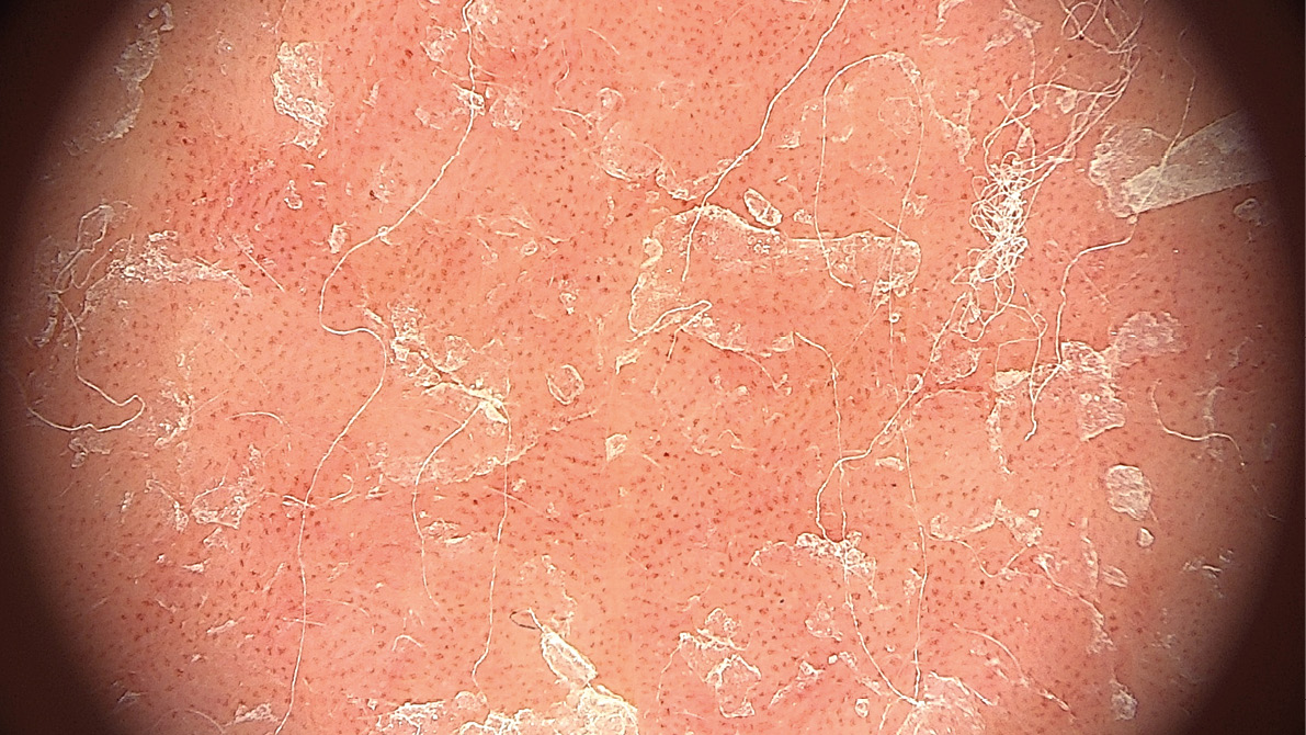 Рис. 2. Дерматоскопическая картина инверсного псориаза, локализующегося в аксиллярной складке (равномерное распределение точечных сосудов, очагово – единичные белые чешуйки); × 20