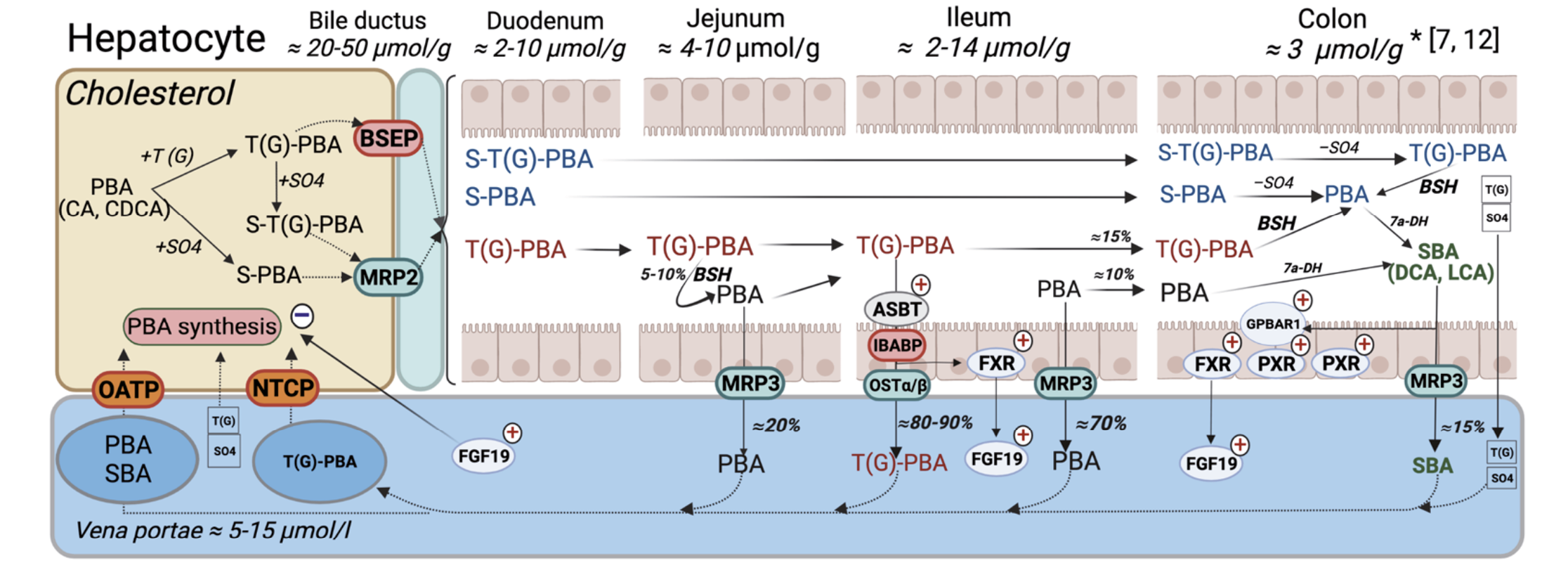 В гепатоцитах ХК и ХДХК амидируются глицином или таурином с образованием конъюгированных солей ЖК. Сульфатирование первичных ЖК происходит в 3-OH-положении посредством сульфотрансферазы (SULT2A1) с образованием сульфатов конъюгированных и неамидированных ЖК. Реакции конъюгирования и сульфатирования способствуют детоксикации ЖК, увеличивают их растворимость, минимизируют пассивную абсорбцию в кишечнике и повышают устойчивость к расщеплению ферментами поджелудочной железы. После синтеза в гепатоцитах конъюгированные и сульфатированные ЖК выводятся в желчные капилляры при помощи экспортирующей помпы ЖК (англ. bile salt export pump, BSEP) и белка 2-го типа, связанного с множественной лекарственной устойчивостью, (англ. multiple drug resistance protein 2, MRP2) соответственно [9]. Билиарные ЖК накапливаются в желчном пузыре и секретируются в двенадцатиперстную кишку после приема пищи. В просвете тонкой кишки ЖК образуют смешанные мицеллы с пищевыми жирами, моноацилглицеринами и жирными кислотами, которые увеличивают площадь поверхности липидов, способствуя перевариванию панкреатическими липазами и абсорбции на мембране щеточной каймы тонкого кишечника [10].