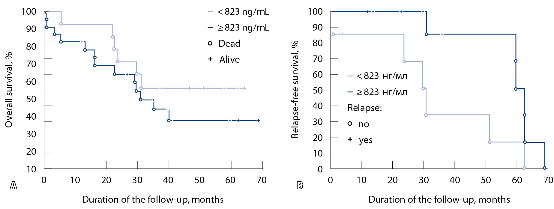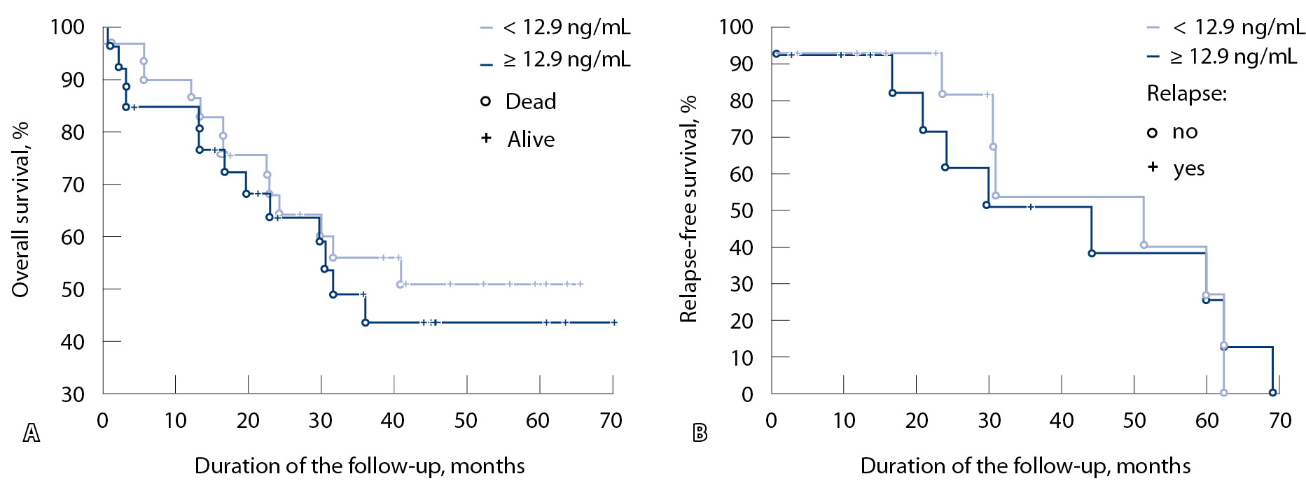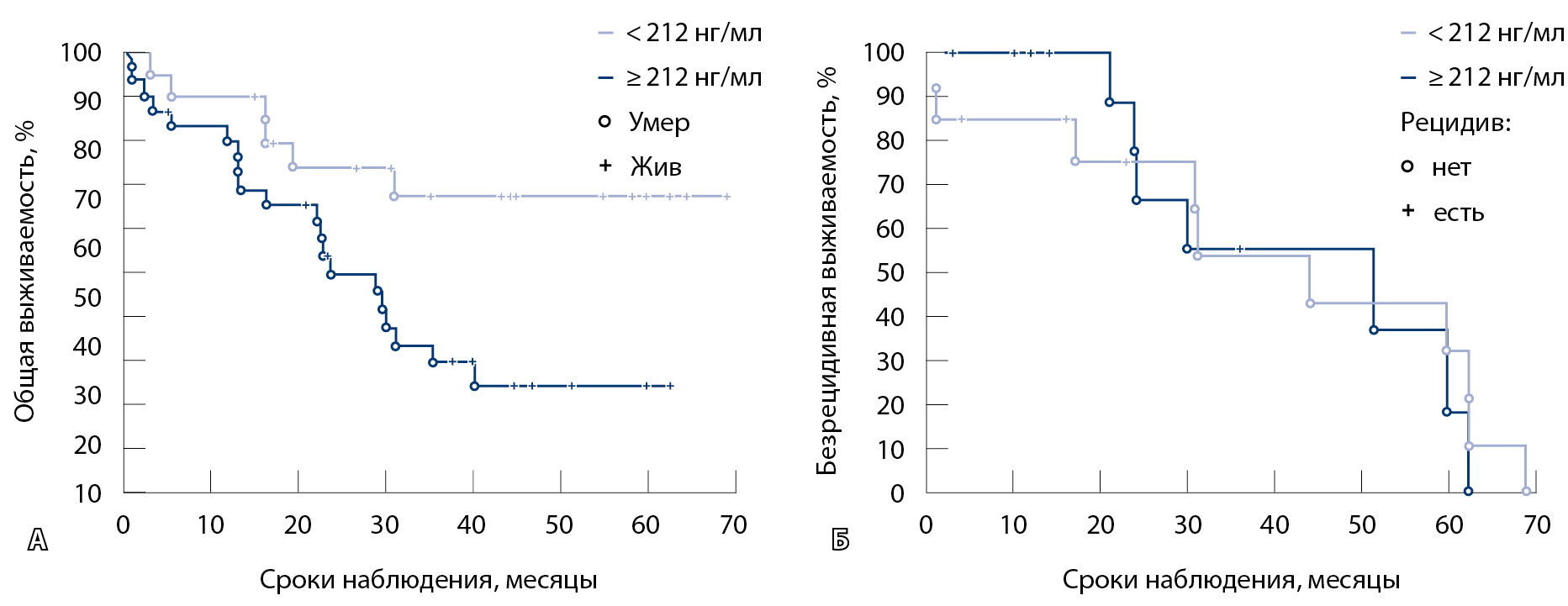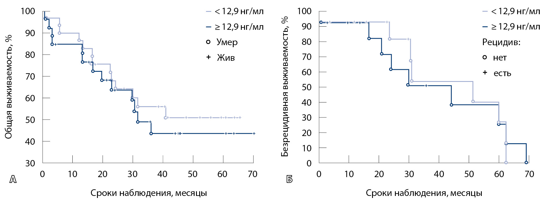 Для оценки влияния уровня галектина-3 на общую и безрецидивную выживаемость больных РЖ при выборе пороговых значений рассматривали концентрации маркера в плазме крови больных РЖ, соответствующие верхнему и нижнему квартилям, а также медиане. Статистически значимых различий общей выживаемости при данных дискриминационных уровнях не отмечено. Наиболее выраженные различия удалось получить при использовании показателя медианы галектина-3 (12,9 нг/мл) (рис. 1А): общая 5-летняя выживаемость в группе пациентов с концентрацией галектина-3 ниже 12,9 нг/мл была выше, чем у больных с более высоким уровнем данного маркера, и превысила 50%. Выживаемость в группе с содержанием маркера более 12,9 нг/мл составила 43% (медиана 30 месяцев), однако различия не достигали уровня статистической значимости (р = 0,59). Как следует из данных рис. 1Б, кривые безрецидивной выживаемости больных РЖ в зависимости от уровня галектина-3 практически не различались (р = 0,52).