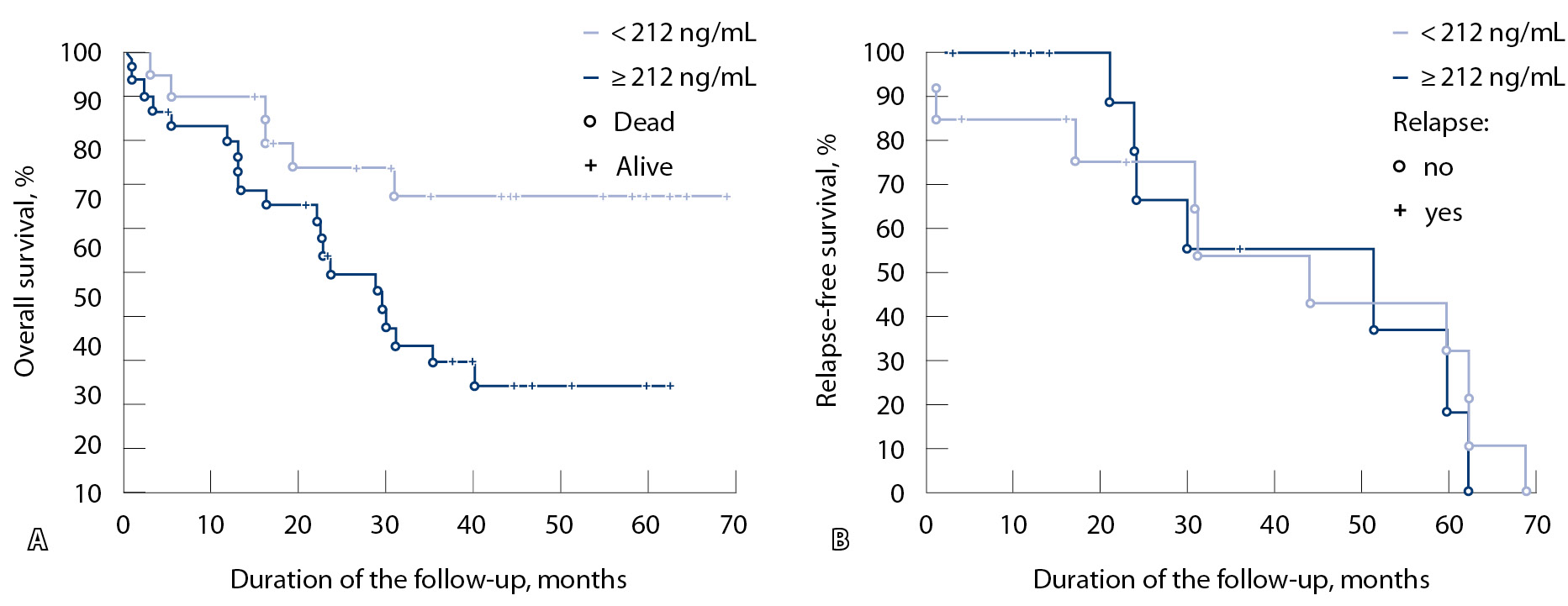 Для оценки прогностической значимости исследованных маркеров проанализировали показатели 5-летней общей и безрецидивной выживаемости обследованных больных РЖ. Расчет общей выживаемости проведен для 60 больных, прослеженных на протяжении от 1 до 70 месяцев (медиана 25,3 месяца). За весь период наблюдения умерли 32 пациента, что составило 53,3%. Продолжительность жизни умерших пациентов была в пределах от 1 до 69 месяцев (медиана 42 месяца). Безрецидивную выживаемость удалось проследить только у 43 больных. Рецидив в течение 3–36 месяцев (медиана 12 месяцев) выявлен у 17 пациентов.