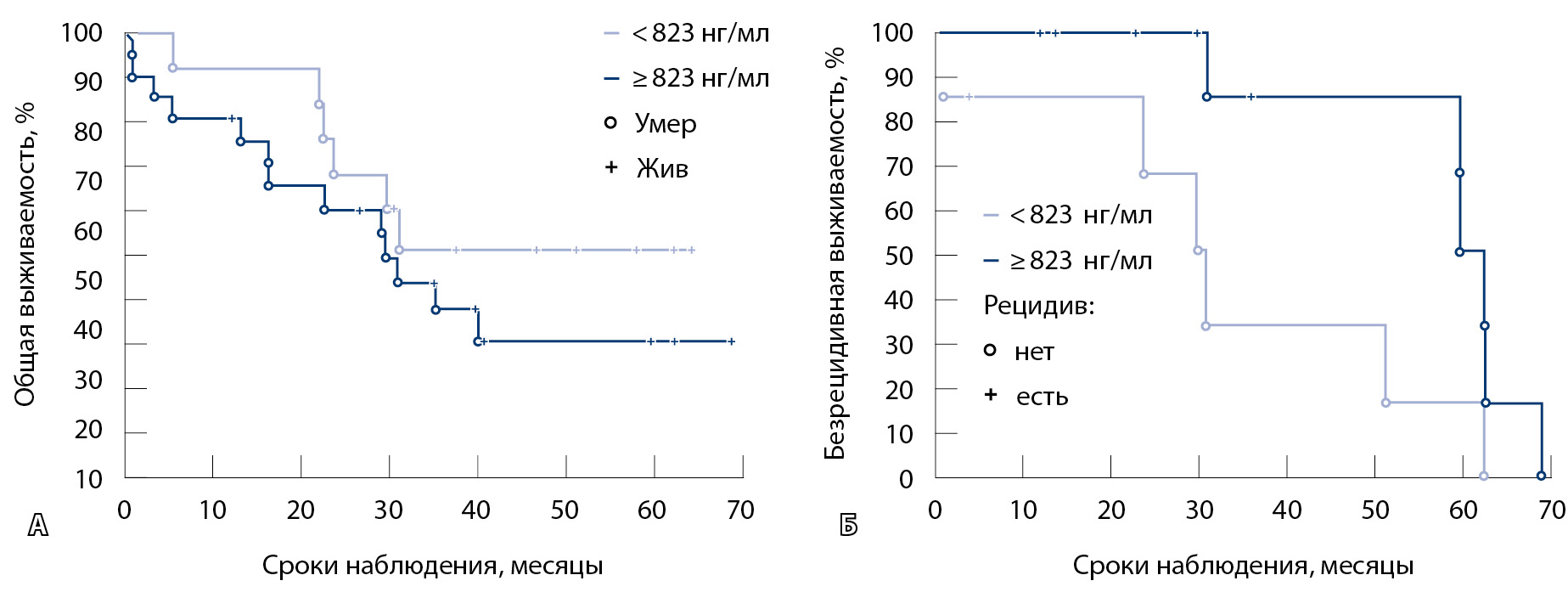 Что касается связи уровня ММП-9 в сыворотке крови с прогнозом больных РЖ, статистически значимых различий мы не обнаружили, но прослеживалась тенденция к улучшению показателей выживаемости при уровнях маркера ниже порогового (823 нг/мл). Показатели общей и безрецидивной 5-летней выживаемости в группе с низкой концентрацией маркера составили 58 и 18% (медиана 32 месяца) соответственно, а в группе с высокой концентрацией ММП-9 в крови общая выживаемость составила 38% (медиана 31 месяц), безрецидивная – 46% (медиана 60 месяцев) (рис. 3; p = 0,29 и p = 0,116 соответственно).