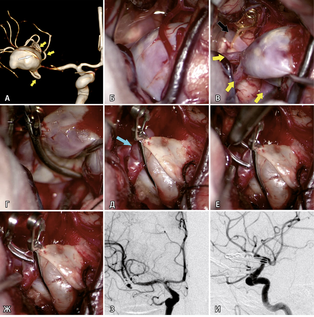 Рис. 1. Клипирование гигантской аневризмы средней мозговой артерии (СМА) справа у пациентки Г., 59 л. А – при компьютерной томографической ангиографии определяется гигантская аневризма трифуркации СМА справа (желтыми стрелками указаны три М2-ветви СМА справа, белой стрелкой указана припаянная к телу аневризмы передняя височная артерия). Б – интраоперационное фото: отмечается выступающее в сильвиеву щель тело аневризмы СМА справа. В – после наложения временной клипсы на М1-сегмент справа (указан черной стрелкой) мешок аневризмы релаксировал, что позволило выделить и визуализировать три М2-ветви (указаны желтыми стрелками). Г – длинная изогнутая клипса наложена на шейку аневризмы. Д – после клипирования наблюдается небольшой остаточный участок шейки аневризмы (указан стрелкой) у теменного М2-сегмента. Е – наложение на остаточный участок шейки аневризмы маленькой изогнутой клипсы. Ж – результат клипирования шейки аневризмы двумя клипсами. З – контрольная церебральная ангиография в прямой проекции. И – контрольная церебральная ангиография в боковой проекции