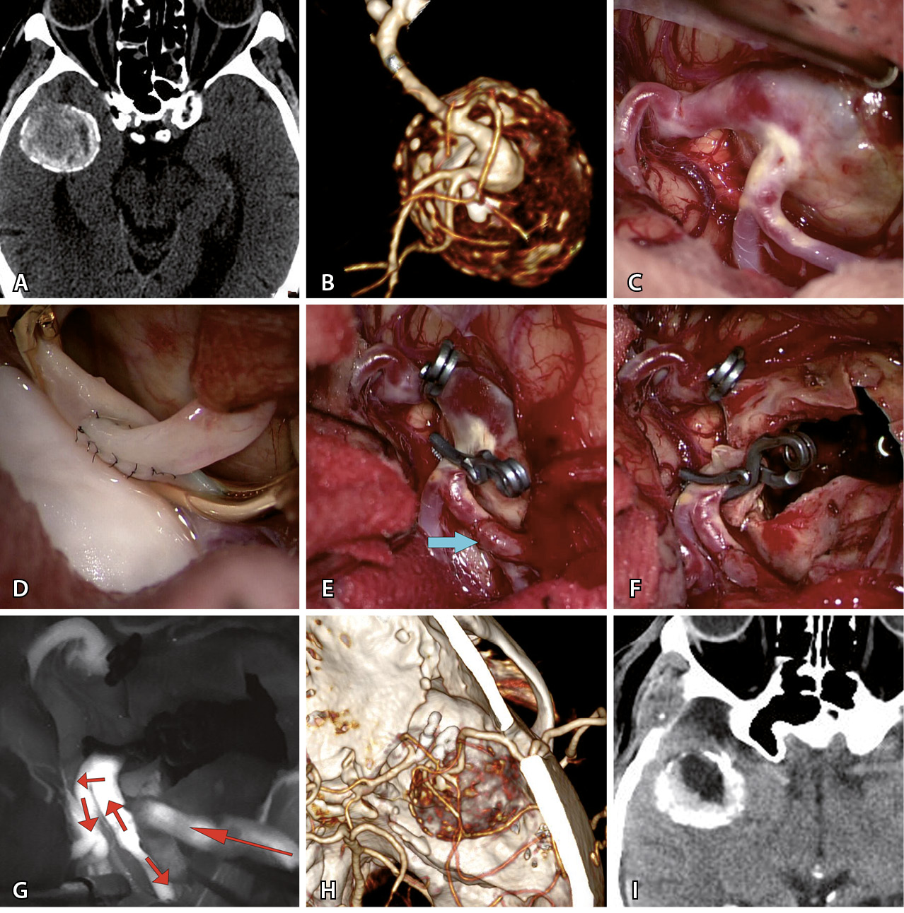 Рис. 2. Треппинг с тромбэктомией гигантской фузиформной частично тромбированной аневризмы М2-сегмента средней мозговой артерии (СМА) после создания экстра-интракраниального микроанастомоза у пациента Т., 69 л. А – компьютерная томография до операции: определяется гигантская частично тромбированная аневризма правой СМА. Б – компьютерная томографическая ангиография (3D) до операции: видна функционирующая часть фузиформной частично тромбированной аневризмы М2-сегмента правой СМА. В – интраоперационное фото: вид аневризмы после препаровки сильвиевой щели. Г – анастомоз между поверхностной височной артерией и М2-сегментом СМА. Д – треппинг аневризмы (стрелкой указан анастомоз). Е – вид аневризмы после тромбэктомии из ее полости. Ж – флюоресцентная видеоангиография: видно хорошее контрастирование шунта через анастомоз и заполнение М2-ветвей (стрелками указано направление кровотока). З – компьютерная томографическая ангиография (3D) после операции: аневризма не контрастируется и хорошо заполняется экстра-интракраниальный анастомоз. И – компьютерная томография головы после операции