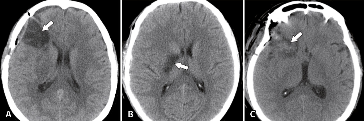Рис. 3. Виды послеоперационных ишемических нарушений (стрелки): А – ишемия в бассейне лобной ветви средней мозговой артерии справа; Б – ишемия в бассейне лентикулостриарной артерии справа; В – ишемия, связанная с нарушением венозного оттока в области правой лобной доли