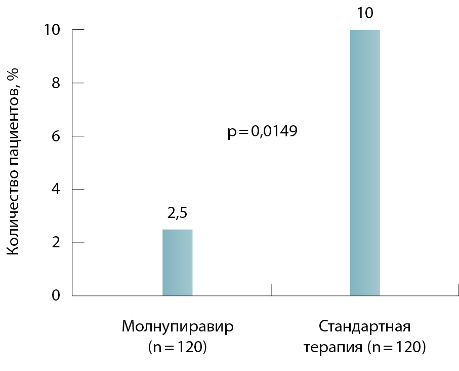 Молнупиравир – один из перспективных препаратов этиотропной терапии для пациентов с COVID-19 в связи с доказанной эффективностью и безопасностью. Это позволяет назначать его пациентам с сопутствующими заболеваниями и большой лекарственной нагрузкой, а также больным, получающим симптоматическое лечение состояний, сопровождающих основное заболевание. Кроме того, назначение молнупиравира обосновано для предотвращения прогрессирования заболевания до более тяжелой формы [17, 20].