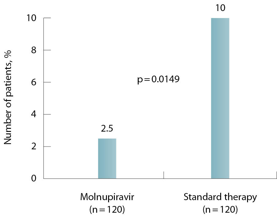 Results: The results of the clinical study in 240 outpatients with mild or moderate COVID-19 showed that molnupiravir at a dose of 800 mg twice daily for 5 days significantly reduced (by 4-hold at days 14–15 of the follow-up) the risk of disease progression to more severe course, compared with the standard therapy group (2.5% (3/120) and 10.0% (12/120) of patients; p = 0.0149.) By days 6–7 of the follow-up, the virus had been eliminated in 71.67% of the patients treated with the study drug and only in 58.3% (70/120) of the patients in the standard therapy group. Complete clinical recovery at days 6–7 was achieved in 19.2% (23/120) of the patients in the molnupiravir group, compared to 5.8% (7/120) in the standard therapy group. Compared to the standard therapy, treatment with molnupiravir also significantly reduced the frequency and severity of the disease symptoms, such as cough and change in odor or taste perception over the last 24 hours, already at 6–7 days after the start of treatment. Molnupiravir treatment was well tolerated, most adverse events were mild. There were no cases of drug withdrawal or dose modification of the study drug due to adverse events.