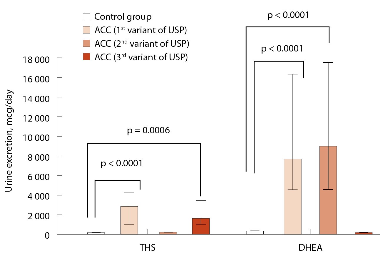 Materials and methods: We performed a retrospective analysis of the data from the study of USP in 59 ACC stage I-IV patients with L. M. Weiss score ≥ 3, according to pathological examination of the surgical samples. The Cushing syndrome was diagnosed by immunochemistry assay in 28 (47.6%) of ACC patients. Tumor staging was done according to ENSAT based on the results of imaging and postoperative histological reports. ENSAT I was diagnosed in 8 patients, ENSAT II in 26, ENSAT III in 14, ENSAT IV in 11 ACC patients. The control group included 28 healthy donors. USP was assessed by GC-MS before surgery with a gas chromatography-mass-spectrometer Shimadzu GCMS-ТQ8050.