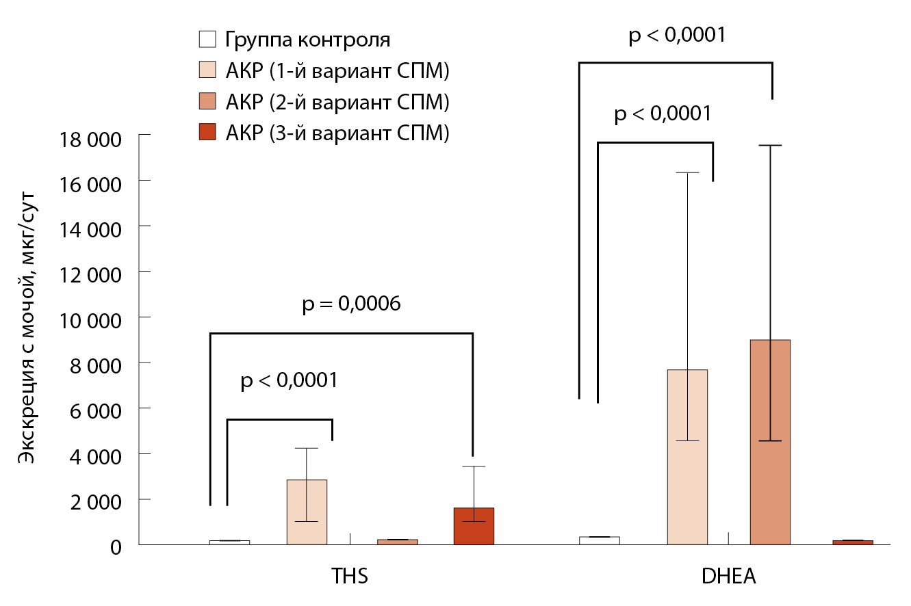 Рис. 1. Экскреция с мочой тетрагидро-11-дезоксикортизола (THS) и дегидроэпиандростерона (DHEA) у больных адренокортикальным раком (АКР) с 1, 2 и 3-м вариантами стероидных профилей мочи (СПМ) по данным газовой хромато-масс-спектрометрии; р – статистическая значимость различий в сравнении с группой контроля
