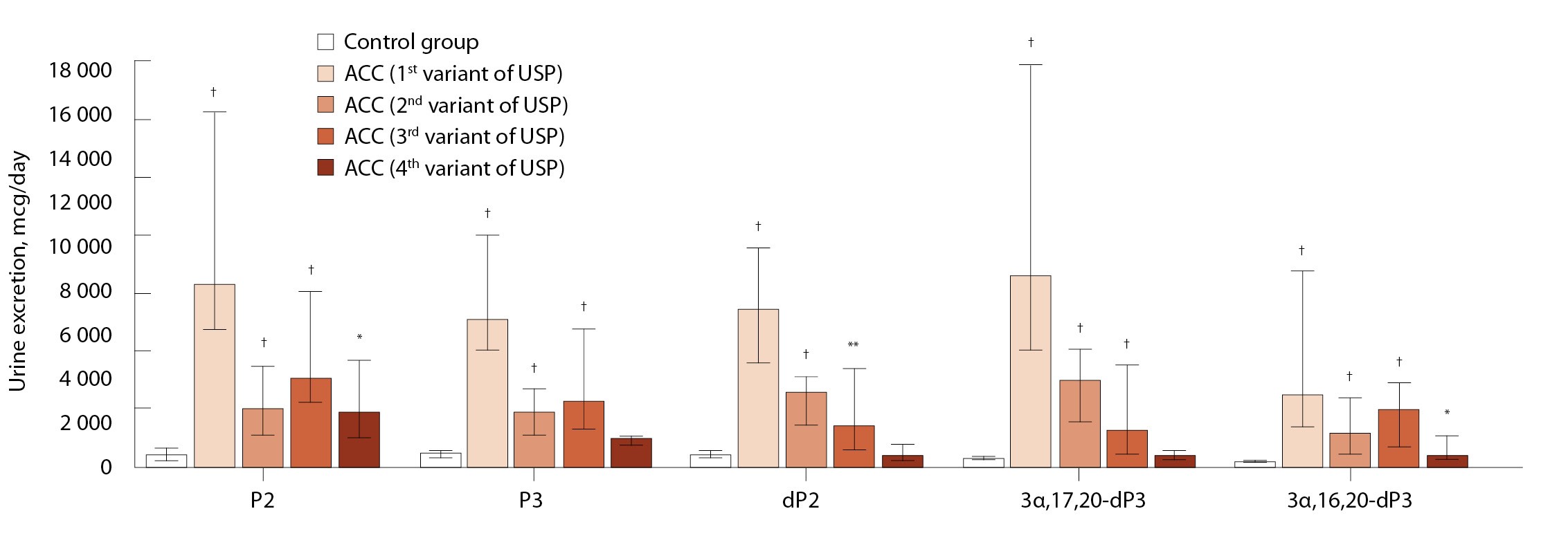 Рис. 2. Экскреция с мочой прогестагенов: прегнандиола (Р2), прегнантриола (Р3), прегнендиола (dP2), 3α,17,20-прегнентриола (3α,17,20-dP3) и 3α,16,20-dP3 у больных адренокортикальным раком (АКР) с 1–4-м вариантами стероидных профилей мочи (СПМ) по данным газовой хромато-масс-спектрометрии; * p < 0,05, ** p < 0,001, † p < 0,0001 – статистическая значимость различий в сравнении с группой контроля