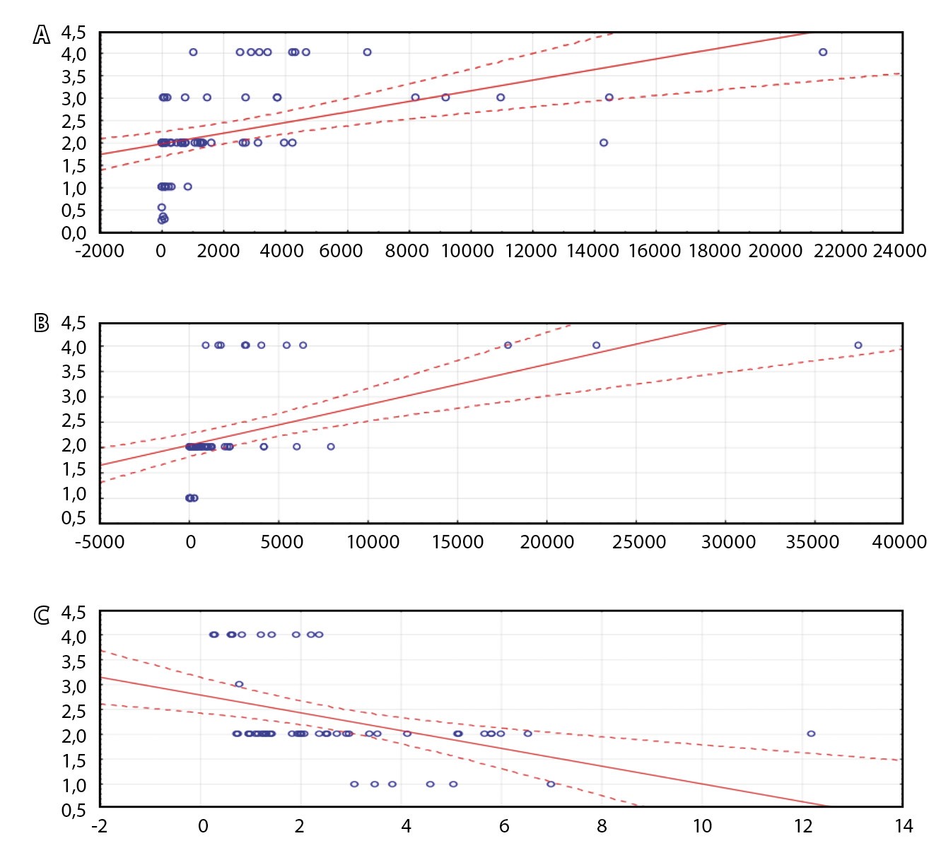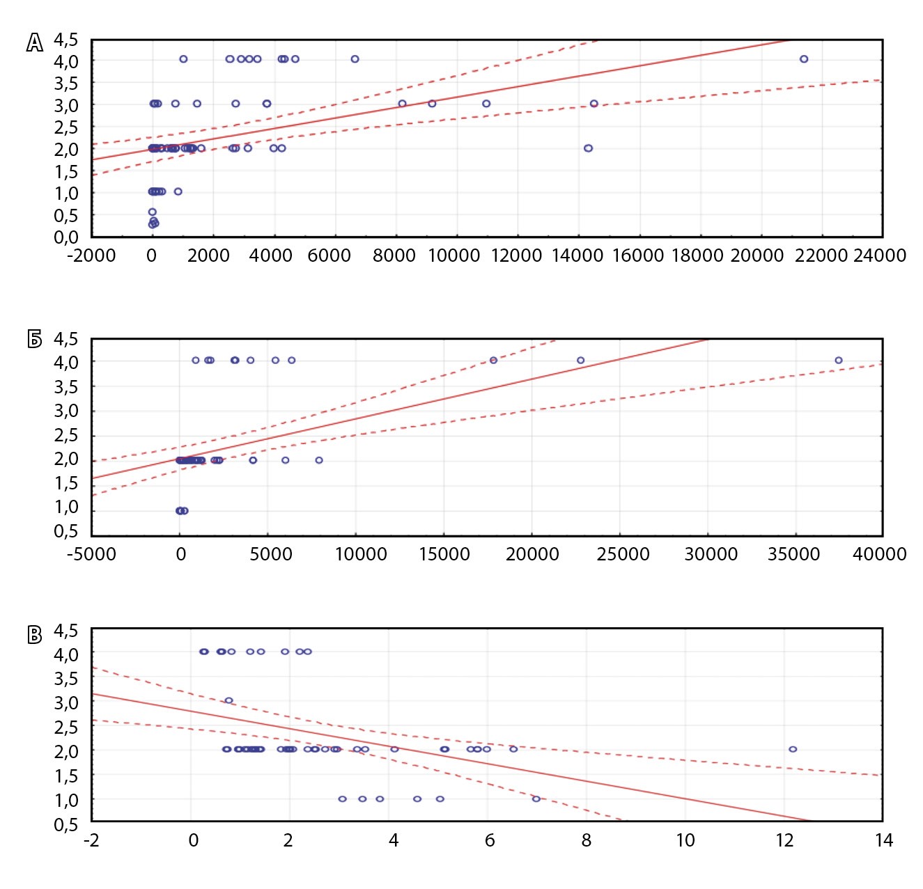 Рис. 3. Диаграммы рассеяния: А – положительная корреляция тетрагидро-11-дезоксикортизола; Б – положительная корреляция 16-ОН-прегнендиол-3β; В – отрицательная корреляция соотношения 16-ОН-dP2-3α/16-ОН-dP2-3β со стадиями адренокортикального рака