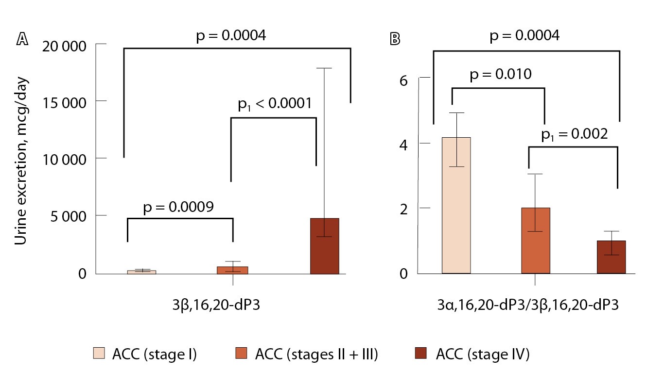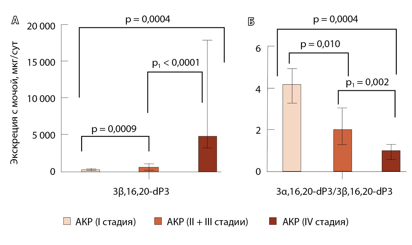 Рис. 4. Экскреция с мочой 3β,16,20-прегнентриола (3β,16,20-dP3) (А) и соотношения 3α,16,20-dP3/3β,16,20-dP3 (Б) у больных адренокортикальным раком (АКР) с I–IV стадиями заболевания; р – статистическая значимость различий показателей больных АКР со II + III и IV стадиями по сравнению с показателями больных АКР с I стадией; p1 – статистическая значимость различий показателей больных АКР с IV стадией по сравнению с показателями больных АКР со II + III cтадиями